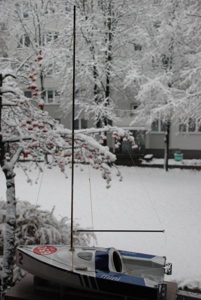 Dziś podczas spaceru obejrzałem moje modelarskie wody ojczyste. Lud jest cieniutki, zapada się jeszcze pod ciężarem kaczki, ale wolnej wody zostało bardzo niewiele. A dziś ma być w nocy -6 -7. Chyba dopiero na wiosnę będzie okazja przepłukać kadłubek. Mirku, mój modelik jest mniejszy( Lc=500, Lw=400). Dla porównania zdjęcie z kadłubem MINI. Chciałem ustawić jeszcze "El Draco", to byłyby trzy epoki w kształtach kadłubów, ale mój największy okręt wietrzy się w piwnicy. Są tylko dwa. Za kilka dni napiszę coś więcej o tym maluchu, i bardzo się cieszę, że komuś się podoba. Dzięki. Z ciekawości po naszej wczorajszej dyskusji popatrzyłem ilu ludzi ściaga się w zawodach klasy NSS-650 standard. Bardzo mało. Chyba nawet nie ma eliminacji. A my się dziwimy dlaczego tak mało ludzi działa w łódkach, nieważne jakich. Ostatni porzeglądałem trochę niemieckich i angielskich czasopism poświeconych zabawom na wodzie. Inne podejście, może bardziej towarzyskie, ale jest liczność uczestników i chyba dobra zabawa.