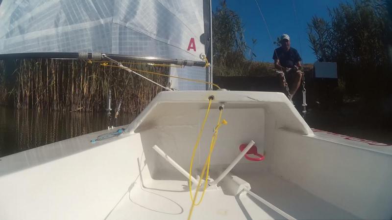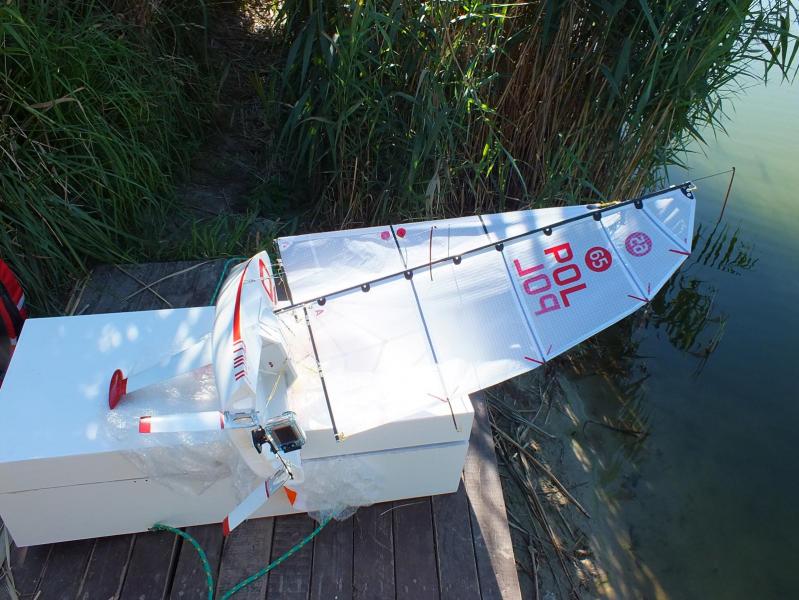 Generalnie tak, jeszcze nie mierzyłem na filmie ,ale spokojnie osiagała na niektórych kursach powyżej 1 m/s to mniej więcej 1,9 w. Po powrocie z tygodniowego pływania po WJM zrobię nowego grota, o podobnym kształcie, ale z mniejszymi usztywnieniami szczególnie głowicy (róg fałowy). Ta która jest niestety czasem się nie wysklepia na drugą stronę i góra grota robi się bardzo płaska. Na zdjęciu dobrze to widać. Tam jest 7 warst Ripstopu. Myślę, że wystarczą trzy.
