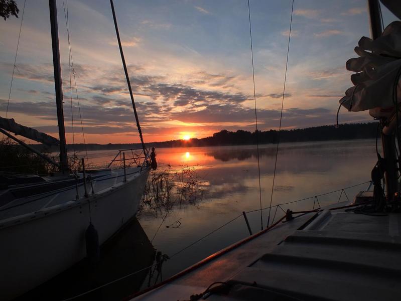 Piotrze, ja też czasem o tym myślę, ale jeszcze jest trochę za wcześnie. Scigać się można nawet na Venusach ważne aby wszyscy mieli równe szanse i decydowały umiejętności. Na razie potrzebny jest przynajmniej jeszcze jeden podobny jacht, wtedy można już spróbowac zorganizowac regaty meczowe, chyba bardziej widowiskowe niż regaty floty. Przepisy żeglugi dużych i małych jachtów różnią się nieznacznie (tak przynajmniej mi się wydaje). W planach mam zbudowanie jeszcze przynajmniej jednego MINI, może wtedy. Może ktoś się skusi na budowę tego dziwnego jachciku. Niedługo powinienem skończyc plany pierwszego i je upublicznić. Na razie uczę się żeglować. To wymaga czasu i ciepliwości. Po kilkunastu godzinach testów i prób na wodzie poznaję model, jego zwyczaje i zachowanie. Wróciłem z tygodniowego pływania po WJM, niestety okupionego lekkim uszkodzeniem skrzynki mieczowej na jachcie. Bardzo niski stan wody (58 cm na wodowskazie w Guziance) spowodował, że na Tyrkle uderzyłem mieczem w kamień (0.8- 1m średnicy). Na wiosnę remont. Teraz jakoś dociągnę do końca sezonu, jacht lekko bierze wodę, ale dam radę. Za to wschody Słońca są coraz piękniejsze. I coś dla oka.