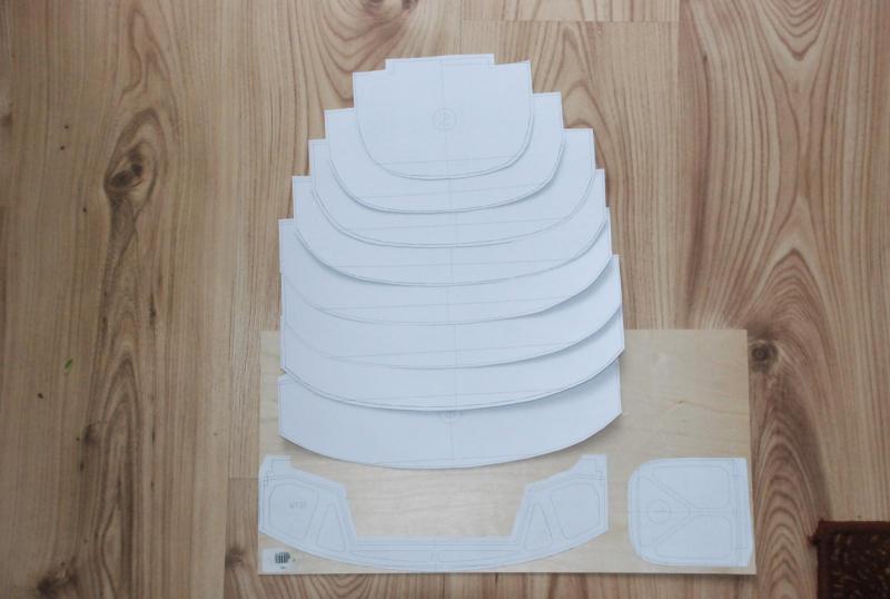 Kolejny krótkim, ale w tym roku wszystkie są takie (tylko tydzień) rejs po Mazurach już za mną. W zasadzie było wszystko: upał na Śniardwach, cisze, wiatr który trochę narozrabiał na WJM, piękne poranki, czasem trochę chłodne, nocne pływanie przy Księzycu. Na szczęście jacht bierze wody zdecydowanie mniej wody niż zaraz po wypadku. Jeszcze jeden wrześniowy rejs , może za tydzień, zobaczymo co czarodzieje od pogody na swych szybkich komputerkach policzą. Ze świeżą porcją wrażeń rozpocząłem budowę prototypu MINI 65 nr 02. Najważniejsza była alceptacja kształu kadłuba. Ostatnia prezentowana wersja została przerysowana na szablony i wydrukowana na brystolu. Część szablonów trafi na sklejkę, dwa W1 i pawęż na sklejkę lotniczą 1.0. Ta ostatnia będzie jeszcze podklejona balsą 2,0. Wręga przy skrzynce mieczowej będzie wykonana w dolnej części ze sklejki 2.0 w górnej z listewek sosonowych 3*2 i 4*2konstrukcja zbliżona do wręg stosowanych w dużych drewnianych jachtach, listwy łączone sklejkowymi nakładkami. Teraz trochę wycinania piłeczką włosową.