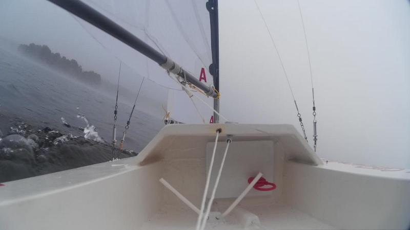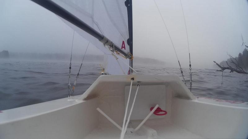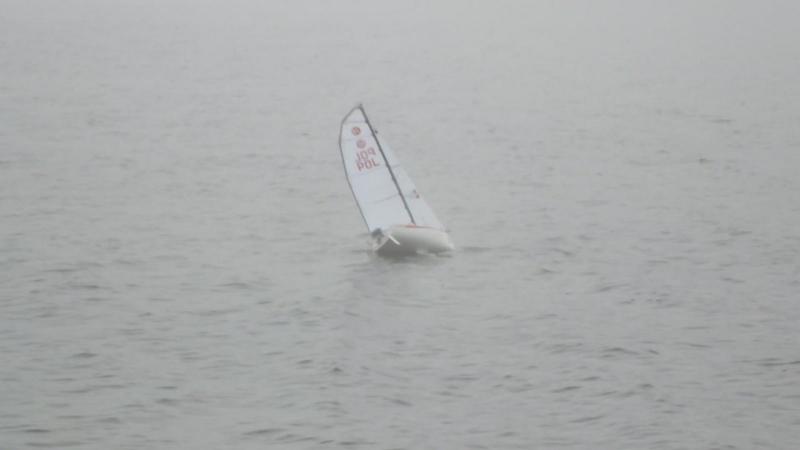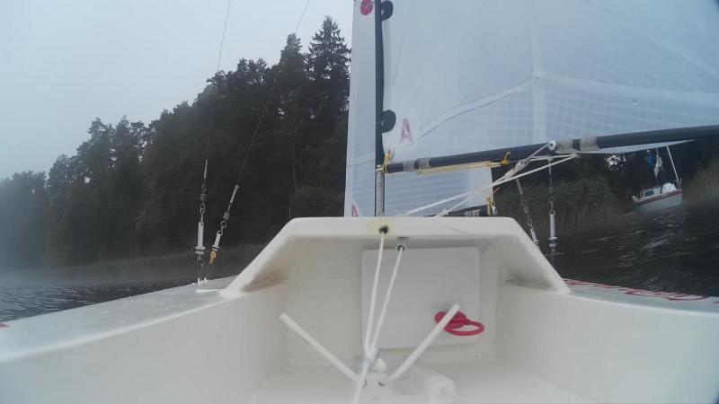 Wróciłem z kolejnego rejsu po Mazurach, będącego jednocześnie zakończeniem sezonu 2015. Tym razem wyjatkowo na pokładzie był jeszcze jeden jacht. Chciałem sprawdzić zachowanie MINI w warunkach trochę większej fali. Akumulatory naładowane pod korek wystrczyły na blisko półtoragodzinne żeglowanie. Jeszcze za wcześnie na wyciagnięcie wniosków, muszę cierpliwie obejżeć i zdjęcia i filmy z kamer i parę rzeczy pomierzyć. Mini żeglowało po pustych jesiennych Beładanach. Te normalnie zatłoczone w sezonie jezioro na przełomie lata i jesieni w środku tygodnia świeci pustkami. Stałem przy Starej Przystani, to południowe wejście Zatoki Wygryńskiej nieopodal wyspy Piasecznej, jedno z moich ulubionych miejsc do biwakowania, czy na brzegu czy w zatoczce obok na kotwicy. Jachcik ku mojemu miłemu zaskoczeniu całkiem dobrze sobie radził z pokonywaniem fali, nie wpadał w rozkołys, tylko delikatnie "myszkował" w baksztagach. Tylko , że przy takiej pogodzie przydaly by się kolorowe i ciemne żagle. Biały ripstop niestety z większej odległości rozmywał się w mgle. Ale co popływałem to moje. Zdjęcia to stopklatki z filmu, który tam powstał. Niestety falka po skosie docierajaca do dziobu Conrada i być może emocje spowodowały, że film jest poszarpany i często brakuje i kadru i ostrości. Jacht przy przechodzeniu wierzchołka fali nie wbijał się w nią, tylko stosunkowo płynnie przechodził. To pewnie zasługa mocno rozchylonych burt w tej części kadłuba.