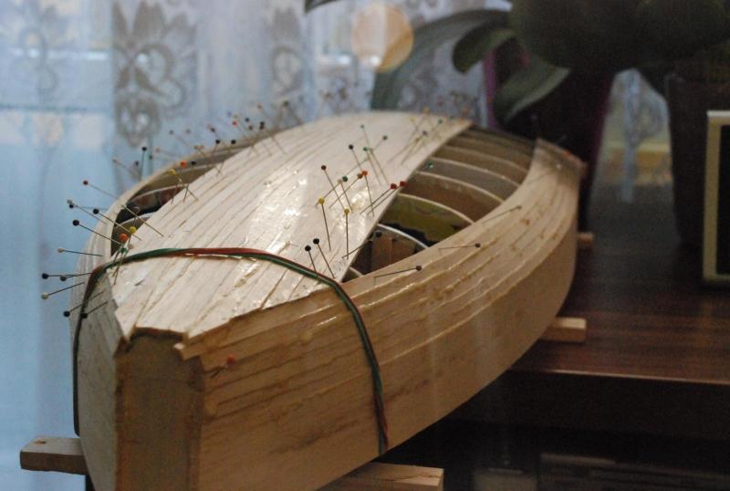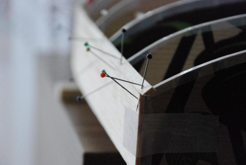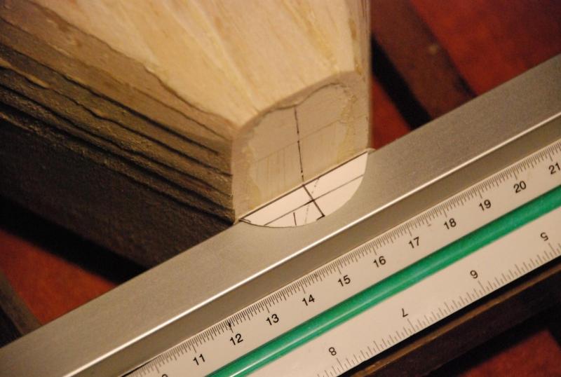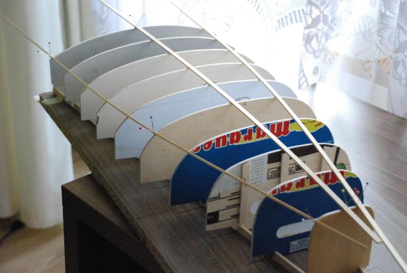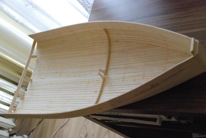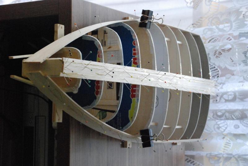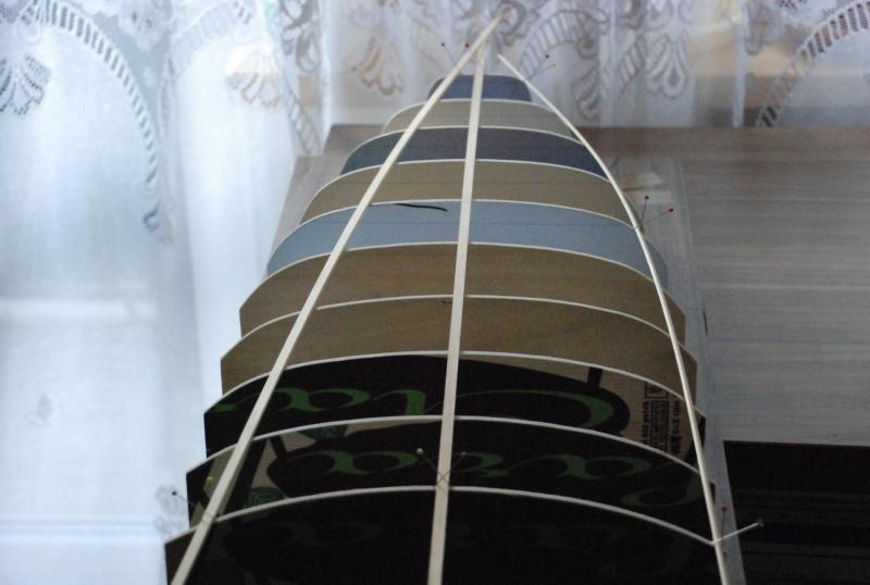 Jak dla mnie i tak za szeroka, ten kadłub jest robiony wg linii z postu #253. Promień zaokrąglenia noska dziobnicy (przez analogię do starszych profilii lotniczych) założyłem R=10. Mogę bez zasadniczych zmian w projekcie zwiększyć go do np. R=15, wtedy paweż cofa się o 4,1 mm i nadal jest 650. Na razie trzymam się projektu. Przykleiłem kolejne dwie klepki i znowu 4 godziny luzu.