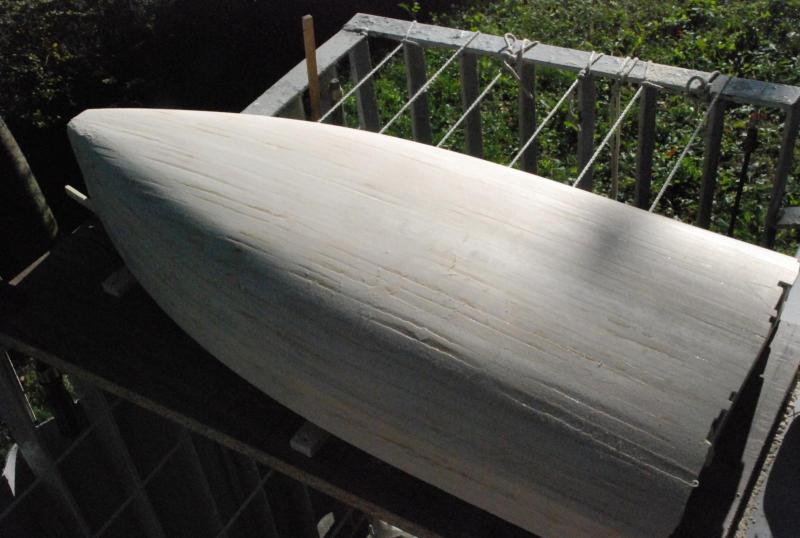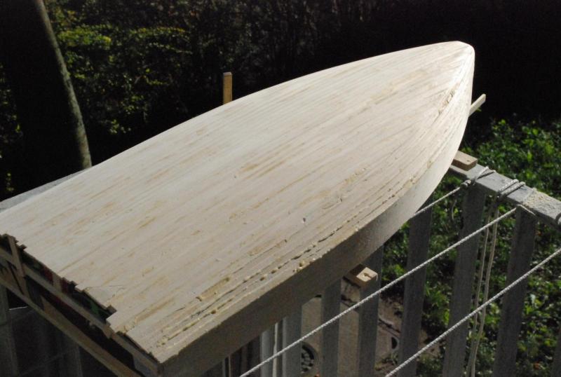 Zakończyłem wklejanie klepek. Bardzo zgrubnie wyszlifowany kadłub. Jak na razie wszystko wskazuje na to, że nie będę musiał używac szpachlówki. Zawsze to trochę oszczędności na wadze. Tak wyglada kadłub w promieniach jesiennego Słońca. Zaczyna przpominać troszeczkę jakiś kształt. Do jachtu jeszcze daleko.