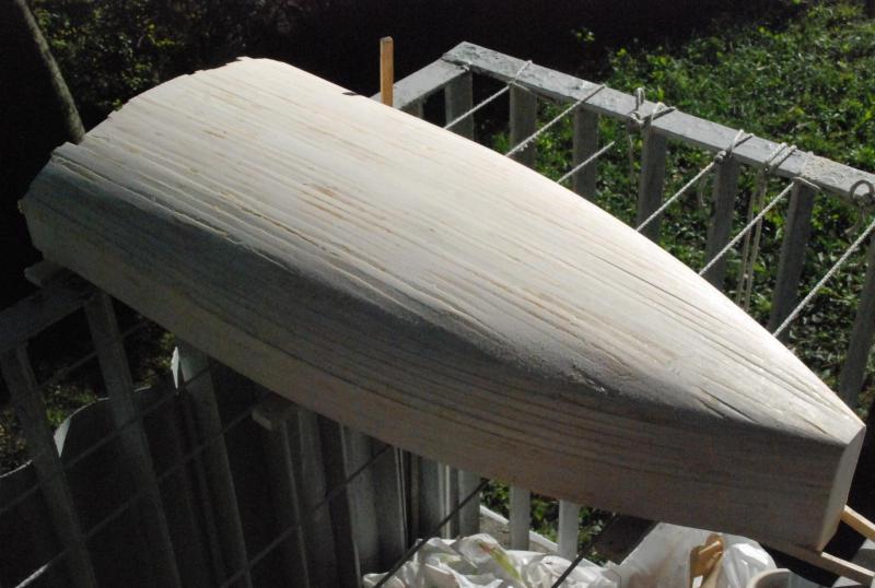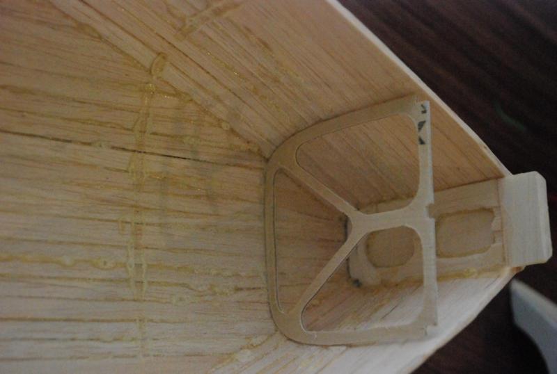 Nastapiło udane rozdzielenie helingu od kadłuba. Operacja, którą pacjent wytrzymał. Kolejna porcja szlifowania. Wstępnie przymierzyłem wręgę dziobową i pawęż. Balsowa skorupa na tym etapie waży 132 g. Najbliższe plany to : - zlikwidowanie wycieków kleju wewnętrz kadłuba, - wzmocnienie burt w miejscu przejścia w pokład - wręga podmasztowa (dennik jest już wklejony w poszycie)