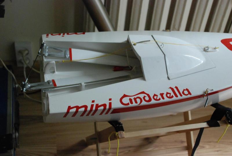 W tak zwanym międzyczasie zrobiłem szkice pozostałych żagli do tego jachciku. Rysunek w załączeniu. Trzy komplety żagli na różne warunki: komplet podstawowy na lekkie watry: SA = 0.3313 m2 komplet na średnie wiaterki: SB = 0.2236 m2 komplet na silniejsze zefirki: SC = 0,1566 m2 Dziś najprawdopodobniej późnym popołudniem MINI spłynie na wodę. Wiaterek ma być do 2 m/s lub mniej z NE->E. Powinno być dobrze. Na pokładzie pojawiła się nazwa jachtu, to już moja trzecia "CINDERELLA". Krój liter podobny do większych siostrzyczek i logo zespołu o tej samej nazwie. Całkiem fajnie grali. MINI65_sailsABC.pdf