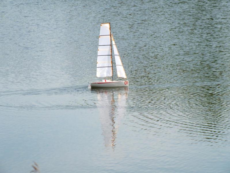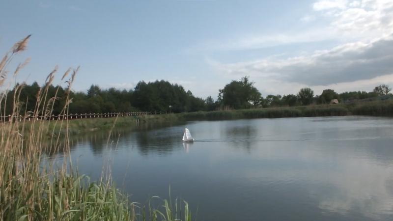 Pierwsze halsy już za rufą. Mini "Cinderella" spłynęła na wodę. To takie małe zwieńczenie pracy nad modelem. Wiaterek słabiutki, akurat na miarę. Tyle chciałem mieć. Na głowę nic nie leci. Matka Natura zaczeła weryfikować model. Grot zgodnie z tym co pisałem wcześniej ma zbyt sztywną głowicę i słaby wiaterek nie wypełnia dobrze góry żagla. Spróbowałem trochę go poprzechylać przebierajac żagle. Wbrew moim obawom jachcik całkiem dobrze trzyma kurs, nawet przy niewielkich podmuchach przechyla się, ale bez wyrażnej tendencji do ostrzenia. Spore płetwy sterowe swoje robią. Pływałem około 25 minut. Nie poznałem jeszcze rzeczywistych możliwości akumulatorów. Po powrocie do domu zmierzyłem napięcie w pakiecie z jachtu, woltomierz pokazał 5,40V czyli jeszcze można spokojnie pływać. Teraz nastąpi analiza co i jak. Po kilku pływaniach spróbuję jakoś to podsumować. Na poczatek dwa zdjęcia już na wodzie.