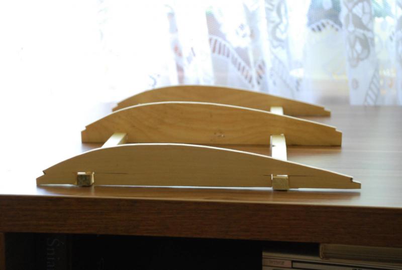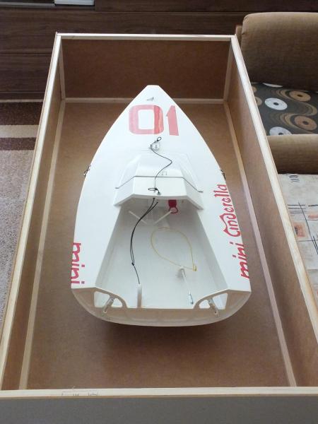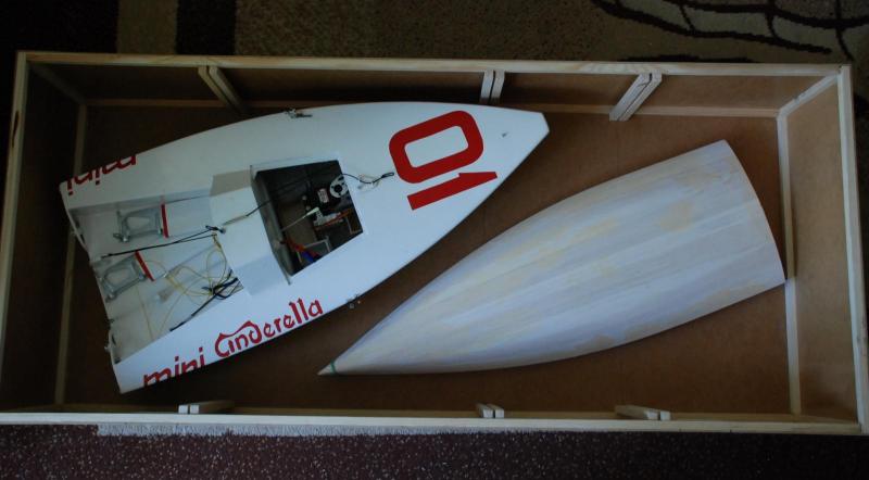 Powolutku powstaje skrzynka transportowa. Raczej skrzynia (1050*460*300). W dolnej częsci będą prowadnice w które będę wsuwał w zależności od potrzeb podpory kadłuba i elementów dodatkowych dopasowane albo do MINI albo do RWD 5. Wchodzą do srodka dwa kadłuby MINI lub jeden RWD. Na zdjęciach próba przymiarki do właściwego rozmieszczenia podpór. Wieko skrzynki (lepiej brzmi) ma wysokość 100 mm i tam spokojnie zmieszczą się maszty z żaglami. Zastanawialem się nad materiałami, ostatecznie zdecydowałem się na nisko budżetowy wariant, czyli meblowy HDF (popularna plecówka) plus listewki sosnowe 10*10.