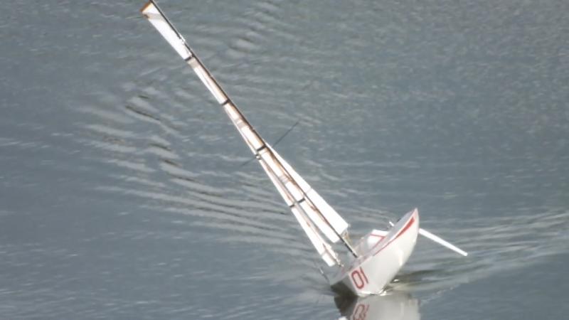 Czas na pierwsze prowizoryczne podsumowanie. Projektowanie i budowa MINI 65 dostarczyły dużo dobrej zabawy i sporo nowych doświadczeń. Wielkość jachtu pozwala bezproblemowo zanieść go nad wodę, pod warunkiem zrobienia odpowiedniego opakowania do trnsportu, głównie chodzi o maszt z żaglami. Największym sukcesem okazało się spełnienie prawie wszystkich założeń projektowych, (poza masą) nie spodziewałem się że taki mały plaskaty jachcik będzie tak zrównoważony i bardzo zwrotny. Nawet przy minimalnej prędkości szybko reagował na ruchy sterem. Żagle wymagają sporo pracy, mam nadzieję z sukcesami. Nadal materialem bedzie Ripstop. Spróbuję zrobić mniejsze stery, na poczatek 3/4 powierzchni tych które są obecnie instalowane. Na razie wymieniłem szoty na mniej sztywną linkę i zmieniłem zaczepienie "fału" grota na tylną remizkę, naciagnie to troszeczkę bardziej górną (topową) listwę. Kolejny grot będzie miał w wersji A prawdopodobnie mniejszą głowicę, ta ma szerokość 160 mm, teraz zrobię, może 120. Zastanawiam się nad zrobieniem również nowej płetwy z bulbem. Ta ma masę około 700g, myslę, że bez znaczącej straty na stateczności poprzecznej można zrobić bulb o masie 450-500g (obecnie 595) i lżejszą płetwę. Chciałbym również zmienić lekko trym podłużny przenosząc balast w stronę rufy (nieznacznie). W tym modelu już nie będę zmieniał wyposażenia, ale tu drzemią spore możliwości obniżenia masy. To co sprawiło największą satysfakcję to stateczność kierunkowa i zrónoważenie jachtu. Płynąc w przechyle około 15-20o nie musiałem pratycznie ruszać sterem kierunku, zwiększenie przechyłu nie skutkowało zmianą kursu, jacht stabilnie płynął nawet przy przechyłach powyżej 450 chociaż wygladał jak żelazko z przyczepioną deską do prasowania. Model doświadczalnie potwierdził metodę liczenia zrównoważenia opartą na trochę innych zasadach niż te opisywane w podręcznikach projektowania jachtów. Przepraszam za jakość zdjęć, to stopklatki z nakręconego filmiku.