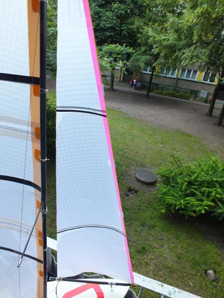 Zamocowałem prowizorycznie foka na bomie i dałem wiaterkowi go owiać. Nowy fok ma zdecydowanie lepszy profil. Inaczej, każdy profil jest lepszy od deski. Jeszzce nie podoba mi się dolny lik, ale to już nie jest duży problem. W ramach eksperymentów i nauki zrobię jeszcze jednego, ale tym razem z czterema brytami. Dolne klejenie będzie zdecydowanie niżej nad dolnym likiem ~50-80 mm. Chcę żagiel trochę zamknąć od dołu. Zmniejszyłem płetwy sterowe, każdą o około 12 cm2. I czas trochę popływać.