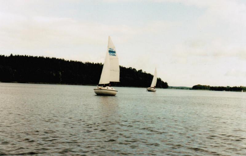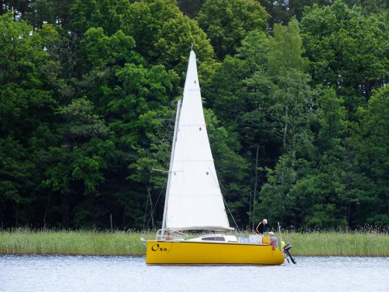 Przeczytałem opis OSY, widziałem ja na żywo. Za pierwszym razem płynęła od strony Guzianki, myślałem w pierwszej chwili że staraciła górę masztu. Rzut przez "długie oko" wyprowadził mnie z błędu. Z kilkoma argumentami konstruktora można polemizować, jak choćby to pływanie przy słabym wietrze i niewielkim przechyle. P. Eckner znany jest z nieszblonowego i raczej niekomercyjnego podejścia do projektowania i bardzo Go za to cenię. Gdy bardzo dawno temu ujrzałem Charlestona spodobał mi się, ale czy chiałbym mieć taki jacht: niekoniecznie. Z Osą podobnie. Jeżeli oglądałeś filmik z mojego pierwszego pływania Mini, tam jachcik polożył się dosyć mocno, ale popłynął bez zmiany kursu. Sterem nic nie machałem. Na C-600 którym snuję się po Mazurach, odpuściłem roler na rzecz trzech foków, każdy do pływania w odpowiednim wiaterku. Podobne z grotem, na drugim refie głowica wystaje niewiele ponad salingi. To pozwala mi pływać przy wietrze przy którym na Mazurach, a szczególnie na moich ulubionych Śniardwach nie wolno pływać. Trochę ingerując w proporcje żagli i pochylenie masztu i ster doprowadziłem do spokojnego trzymania kursu przy przechyłach 40- 45 o . Mało współczesnych łódek ze śródlądzia to potrafi. Na razie pokleiłem nowego, lżejszego foka. Liki tylny i przedni jeszcze do przycięcia, tam mam okolo 3-5 zapasu. Zdecydowanie mniejsze i delikatniejsze wzmocnienia rogów żagla. Chcę zobaczyć jak wyjdzie żagiel klejony na trochę innym szablonie niż pierwszy fok. I na koniec zdjęcie OSY. Czy jest ładna, moim zdaniem nie, zbyt wysokie burty psują sylwetkę.