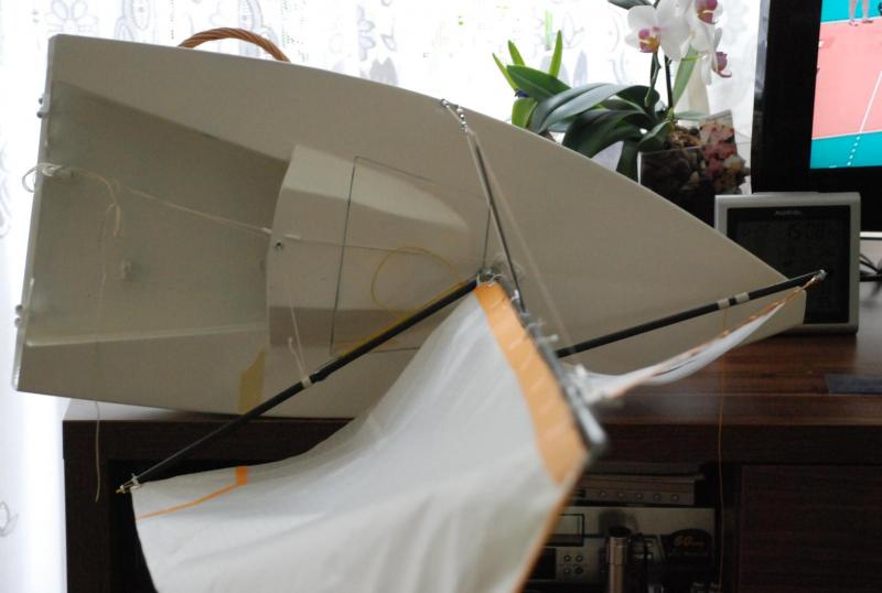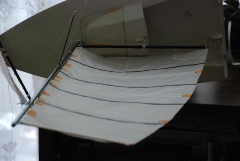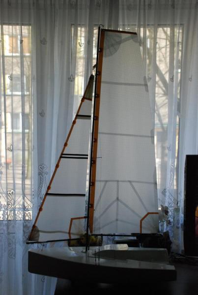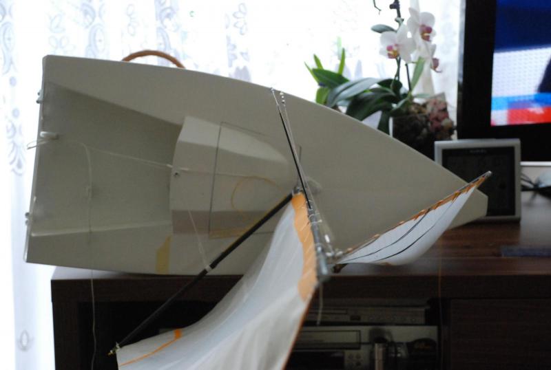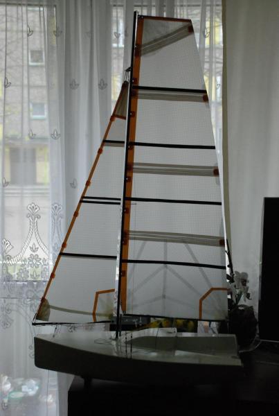 Czas już zobaczyć jak jachcik będzie wyglądał pod żaglami. Grot jeszcze bez listew, nie układa się zbyt dobrze, ale to na tym etapie nie jest aż tak bardzo istotne. Oczywiście są błędy wynikające z niewiedzy. Zbyt sztywne (za duże i z za dużą ilością warstw) są głowice, szczególnie halsowa. Nie wiem czy wiaterek da radę wypełnić prawidłowo grota po zwrocie. To już wyjdzie w czasie prób z wiatrem. Na pierwszy rzut oka widać dosyć dużą różnice na plus w powierzchni ożaglowania w stosunku do typowych modeli żaglowych różnych klas. W zasadzie tylko 12 calowce mają podobne proporcje.