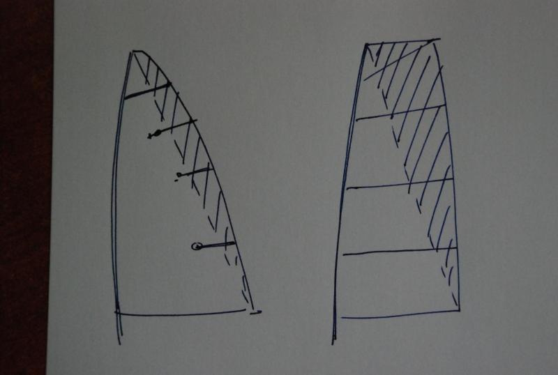 Ku mojemu zaskoczeniu, dopiero teraz zdałem sobie sprawę, że "Cinderella" ma w zasadzie ożaglowanie gaflowe, co prawda gafel jest w poziomie ale jest. Dziwny ten świat. Przemyślałem krój żagli i będą pewne zmiany w szablonach. Na początek grot w wersji podstawowej. ------------------------------------------------ - obrys bez zmian - uklad listew (najwyższa lekko w dół) - mniejsze głowice rogów - inny rozstaw mocować do masztu, końcowe bliżej noków - węższe sklejki brytów, około 5-7 mm - wprowdzenie profilu przejściowego w górnej częsci zagla (rysunek) - zmiana górngeo profilu (rysunek) W sumie nieznaczne korekty, ale mam taką nadzieję, że następny grot będzie już taki jakiego bym sobie życzył. Pierwsze próby na wodzie będą z prototypem.