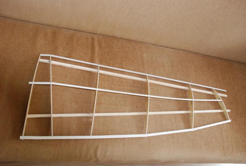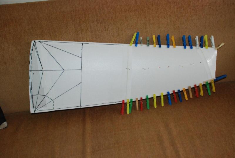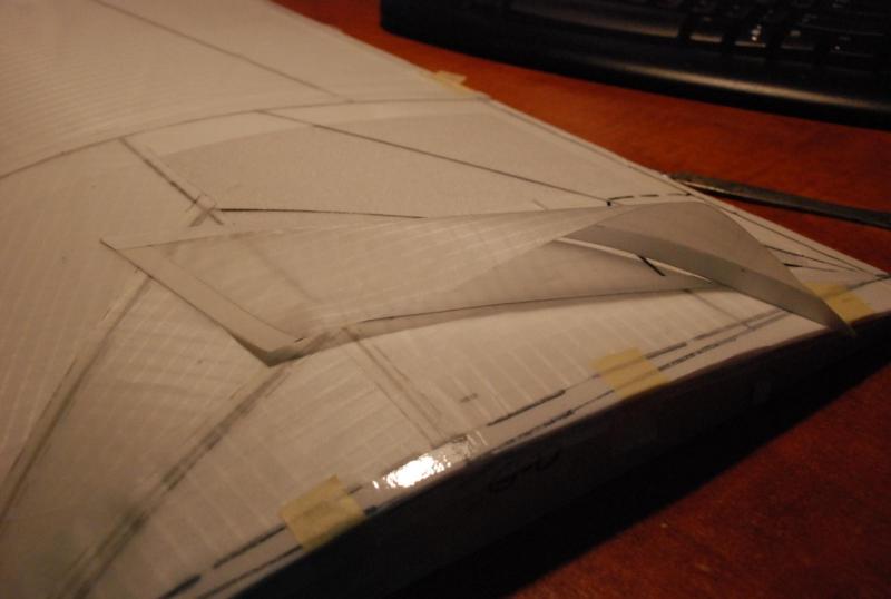 W tak zwanym międzyczasie zrobiłem szablon do klejenia grota. Idea ta sama co przy foku, jednak kostrukcja trochę zmieniona. - szablon jest większy o około 10 mm w każdym kierunku, pozwoli to bezproblemowe przyklejenie tkaniny podczas trasowania brytu - pokrycie szblonu będzie wykonane z depronu 3mm, zdecydowanie sztywniejszego niż karton który zastosowałem przy foku. Wygląda jak skrzydło, powierzchnia grota (0.238 m2 w rzucie) to troszkę więcej niż jachciki o tej samej długości klas NSS 650 lub RG 65 mają w całości.