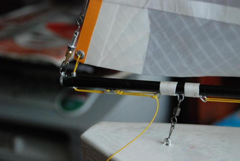 Tak wyglądaja na gotowo zaczep bomu i obciagacza. Długością tulejek mogę regulować odsunięcie osi obrotu a tym samym zmianę profilu grota i ewentualną nierównoległość osi maszy i osi zaczepów. To pozwoliłoby zmieniać napięcie obciągacza bomu w zależnościod wychylenia bomu. Akurat mam sporo skrawków Ripstopu (32 g/m^2 i 50) i chcę go wykorzystać. To tkanina kalandrowana o praktycznie zerowej rozciagliwości i nie boję się o wydmuchanie. Jak będzie naprawdę czas pokaże. To mój pierwszy model jachtu, popełniłem sporo błędów wynikających z niewiedzy i braku doświadczenia. Ale coraz bliżej wodowania i po pierwszych halsach bedę dużo więcej wiedział co jeszcze jest do poprawienia i zmiany. Sprwadziłem chyba wszystkie szanowane sklepy dla plastyków, architektów itd. Nigdzie nie ma i nawet nie słyszano o kalkach mylarowych. Gdzie to można kupić?