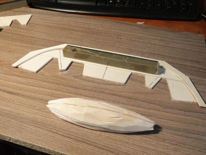 Skleiłem skrzyneczki do formy gipsowej bulba. Zastanawiam się czy i jak jest możliwe zdobycie w prosty sposób około 15-20 gramów antymonu. Ewentualnie wizyta w jakiejś przestarzałej drukarni. Trochę popracowałem nad płetwami i urządzeniem sterowym. Dźwignie (T) będa wklejone w rowki w płetwie. Końcówki skręcone o około 250 tak, żeby zminimalizować ruchy przegubu kulowego w snapie. Prawa, bedzie miala przynitowaną dźwignie poprzeczną napędzną z serwa.