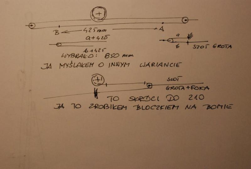 Jarku to zadziała dokładnie odwrotnie, jezeli przesunę bloczek o powiedzmy 400 mm to on wybierze 800 szota, zaraz zrobię rysunek to Ci wyjaśnię. Ja myślałem o wewnętrznej talii, ale wtedy trzeba by dać lekki naciąg , aby linka gdzieś się po drodze nie zakleszczyła, jakaś długa gumka która by się rozciągała nie wprowadzając dużych sił. Na tym etapie to są dopiero prace koncepcyjne, zobaczę jak zrobię pierwszy bloczek, jeżeli będzie chodził leciutko, to zrobię bloczki, jeżeli nie to zmienię serwo. Przepraszam za zdjęcie ale chyba jest czytelne. Do tego komputerka nie mam podłaczonego skanera, ( brak sterowników do Unixa) skipper ---------------------- ps. zacząłem lepić formę pod pokład