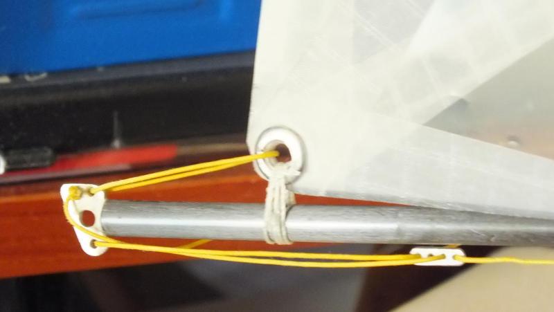 Martwi mnie ta fałda na grocie ( od rogu szotowego), ale zacząłbym od wybrania obciagacza bomu. Na kilku zdjęcich widać mocno wybrany bom grota, natomiast góra żagla jest otwarta. Tak duży skręt żagla może wynikac albo niewłasciwego kroju, albo ze zbyt poluzowanego obciagacza bomu. Róg szotowy grota masz mocowany do noku bomu, spróbuj zrobić przewiaz do bomu i oddzielną linkę do napinania dolnego liku zagla. Wtedy będziesz mógl regulować w pwenym zakresie profil grota tą jedną linką. Coś podobnego jak na zdjęciu. Na Twoich zdjęciach nie widzę listew, jeżeli są to jaką mają długość (zdjęcie pod światło wiele by rozjaśniło). Jeżeli będziesz robił nowego foka, tnij go tak, żeby przy wybranych szotach róg szotowy był wyżej niż halsowy. To zdecydowanie lepiej wygląda na wodzie. -