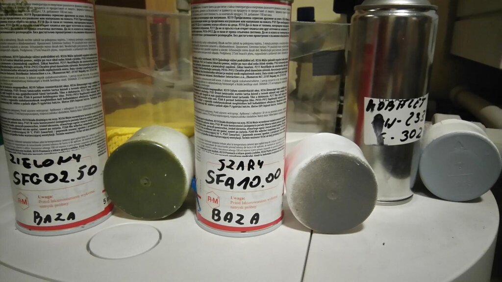 Farby z mieszalni z palety ral, ten jaśniejszy szary ma jakieś inne oznaczenie, którego nie umiem rozszyfrować a do miejsca gdzie go zamawiałem nie mam już kontaktu. te dwie puszki z dopiskiem baza szły na górę, a ta trzecia od spodu. ogólnie farby humbrol też są dobre,(dark green, ocean grey, medium sea grey) ale w przypadku mojego modelu zrezygnowałem ze względu na skalę.