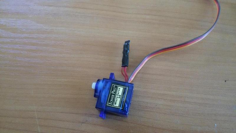 5. Nóżki potencjometru zabezpieczamy przed zwarciem (można je pozaginać) wkładamy elektronikę z powrotem do serwa oraz wyprowadzamy trzy przewody na zewnątrz serwa: