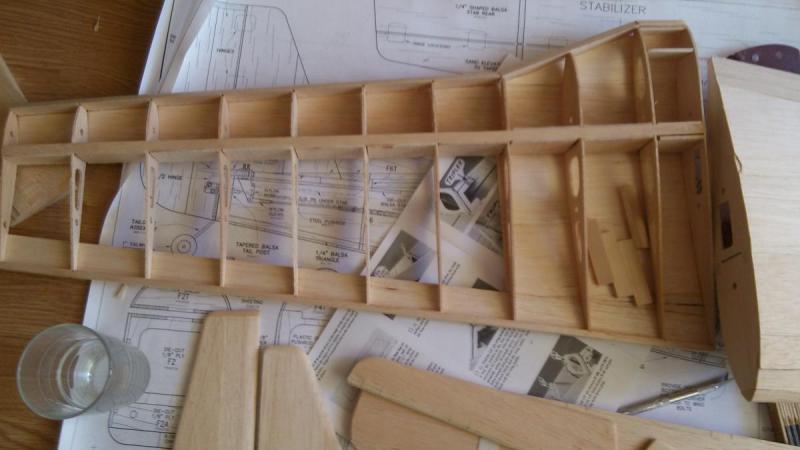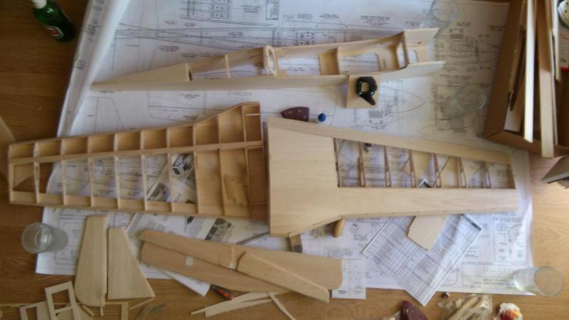 Model .40 rozpiętość skrzydeł 1450mm kadłub 1270mm lotka też właśnie za wąska mi się wydaje, aby jeszcze ją dzielić Wszystko co od wczoraj zmontowałem: Stabilizator poziomy i pionowy, lotka kierunku i lotka wysokości. + kawałek skrzydła