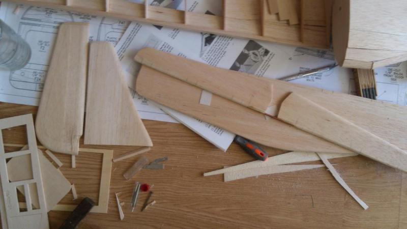 Mam stery kierunku i wysokości, stabilizator poziomy i pionowy oraz dwa skrzydła ukończone w 50%. Czekam na dostawę mechanizmu do podwozia chowanego i kół No i kupię kawałek balsy na szersze lotki żebym mógł klapy zrobić Na planach lotka jest szerokości 20mm - jakiej długości zakupić, aby dało radę wcisnąć klapy? 40mm? 50mm?