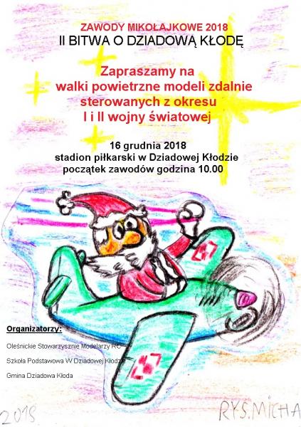 11. G.W. plakatu Michał i Grzesiu. Witam Harmonogram imprezy oraz wpisowe ( około 30 zł) zostanie podany w piatek jak będzie znana ilość zawodników. Organizator zapewni ciepły posiłek i napoje oraz prąd( mile widziane własne przedłużacze) , tasiemki i słupki. Szatnia został świeżo wyremontowana więc będzie gdzie posiedzieć i się ogrzać. Niestety lapa oświetlająca stadion dale stoi w tym samym miejscu:) Lista pilotów 1. Grzegorz Bielecki WWI WWII, 2,4Ghz 2. Wojciech Krajnik WWI WWII FM k.61 3. Dariusz Stężalski WWI WWII FM k.66 4. Marcin Olas WWI WWII 2,4 Ghz 5. Piotr Berus WWI WWII 2,4 Ghz 6. Andrzej Stasiak WWI WWII 7. Mirosław Skowroński WWI WWII FM k.68 8. Tomasz Betka WWI WWII 2,4Ghz 9. Marek Betka WWI WWII FM k.80 10. Karol Wdowikowski WWII 2,4Ghz 11. Jarosław Janus WWI WWII 2.4Ghz 12. Bogdan Skoczylas WWII 2,4Ghz 13. Krzysztof Wieczorek WWI WWII 2,4 Ghz 14. Zbigniew Bzdęga WWI WWII 2,4Ghz 15. Michał Wdowikowski WWII 16. Zbigniew Wdowikowsk WWI WWII 17. Tadeusz Cieślik WWI WWII Pozdrawiam Piotr
