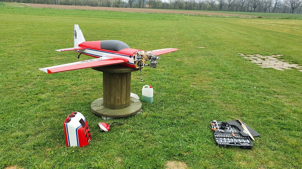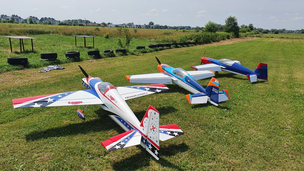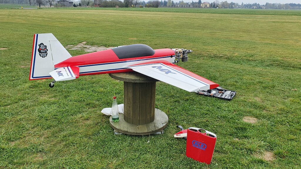 Pierwszy wniosek to taki że jak już mam laminata, to musze kupić pokrowiec na aparaturę, żeby nie mokła podczas deszczu. Wiatr mi nie przeszkadza tak bardzo jak deszcz... Po pierwszym krótkim locie nic oprócz tego, że model lata nie mogę powiedzieć. Czekamy na pogodę (tzn bez opadów ). Teraz żmudny acz istotny proces ustawiania, kątów silnika, CG, wychyleń, expo itp... Zdecydowałem się, żeby uzbroić ten model po wizycie na pikniku w Dubaju gdzie wiedziałem jak można nim pokręcić. Ok wiadomo nie będzie trak szybki jak mój poprzedni EF laser 104", ale mimo wszystko widzę potencjał. A jeśli mi nie przypadnie do gustu, to Panie Marcinie , EF 114" SLICK is on the way A i ostatecznie waga bez paliwa 18,7kg ( Marcin wyjął te kombinerki co zapomniał) - więc w sumie lekko. Wyposażenie : Powered by GP 178v2 + JMB TRC 70L mufflers Powerbox Competition SRS2 + Smoke System BlueBird HV BLS H71B i M52B servos Falcon 31x12 Dualsky LiPo 2x 2s4000 + 2700 Futaba 18sz 70th