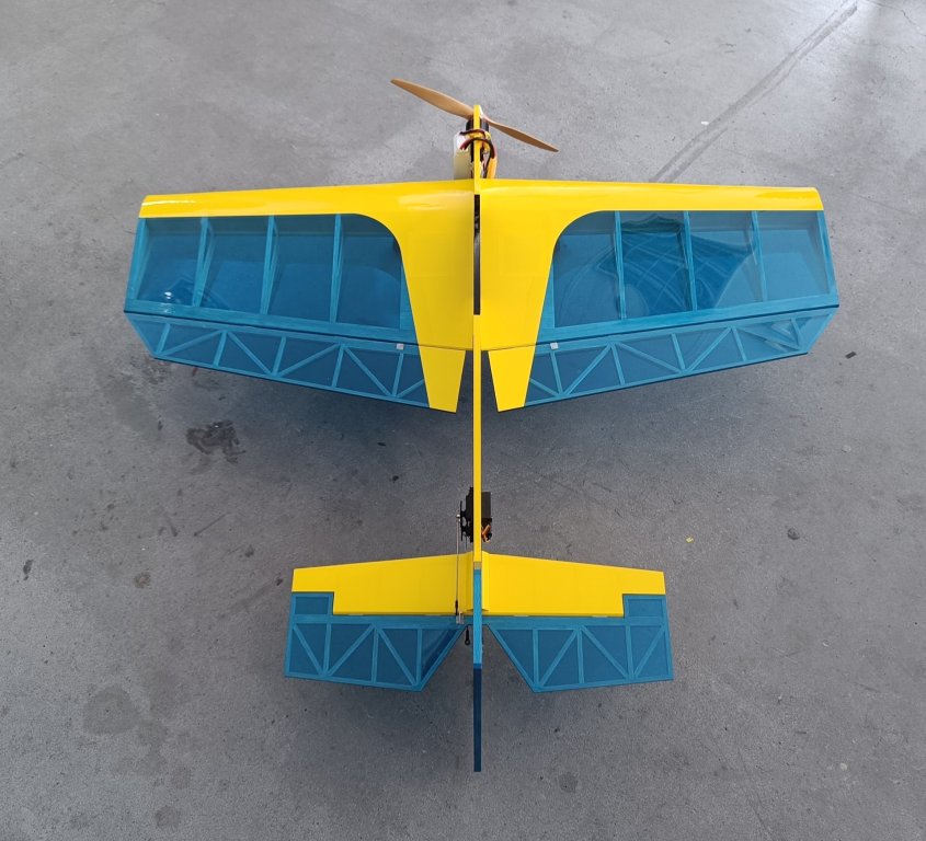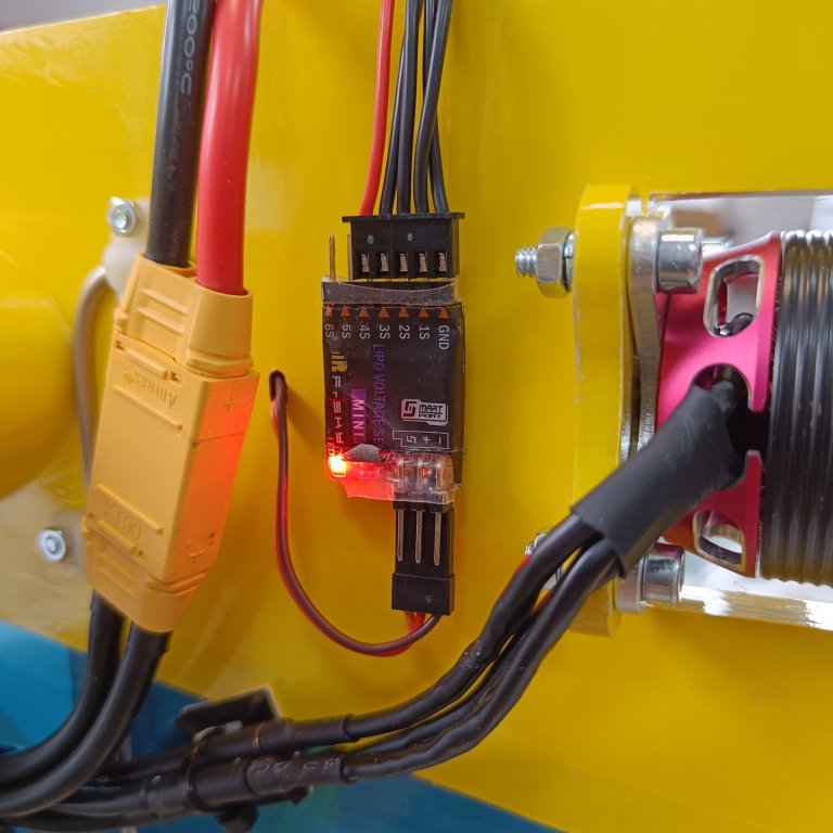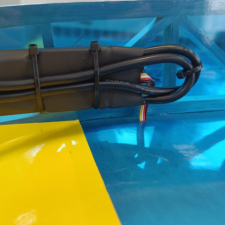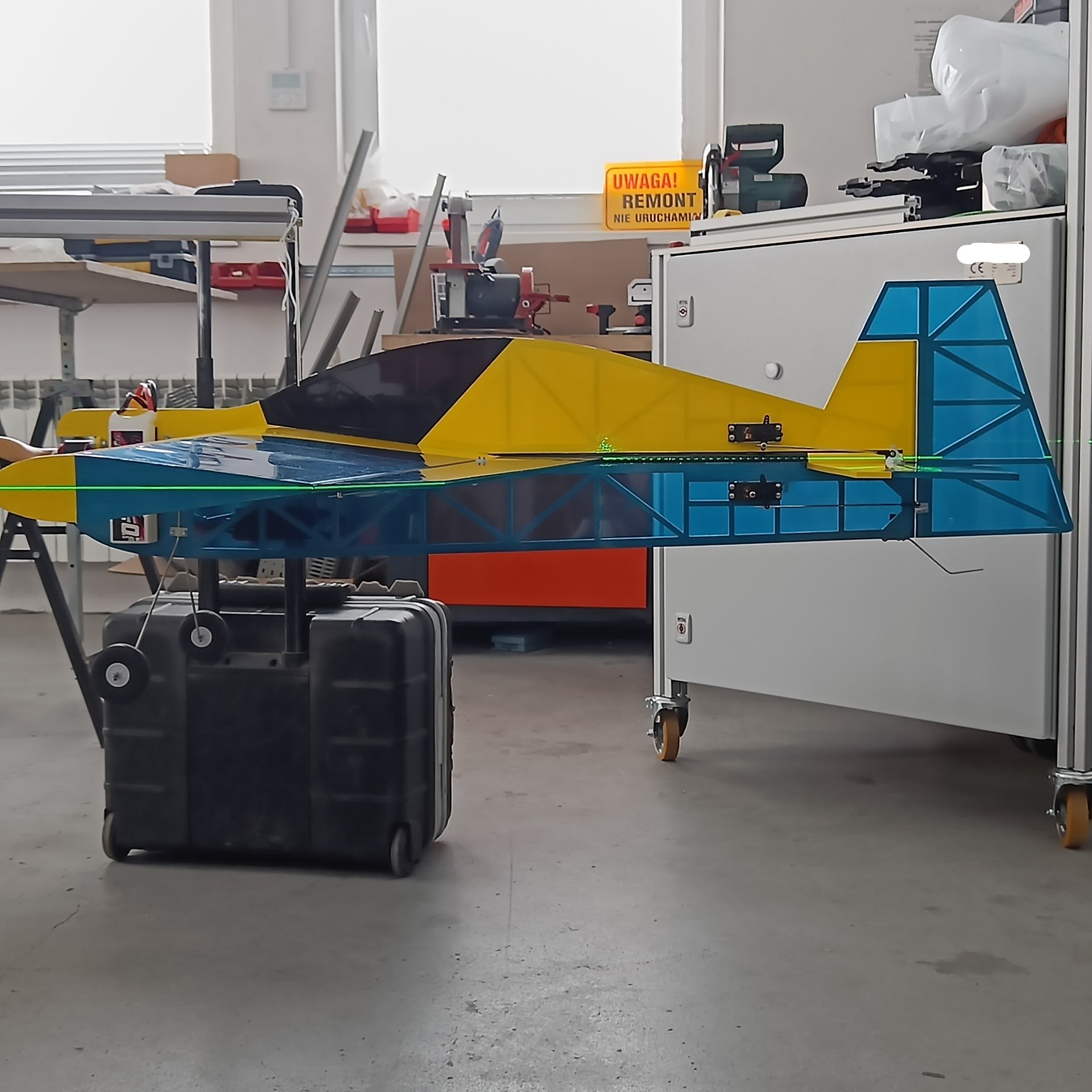 Miałem nadzieję, że to będzie ostatni wpis z budowy, ale jednak potrzebna będzie jeszcze dogrywka Ster wysokości wklejony, sprawdzony laserem i na oko. Wnęka musi być trochę szersza, żeby na początku przełożyć tę ruchomą część, więc po sklejeniu całości zaślepiam kawałkiem balsy tę nadmiarową przestrzeń. Mocowanie silnika kleję na żywicę, a dla pewności dodaję dwa wkręty. Podwozie zrobiłem z drutu 3mm. Na ogonie nie przewiduję kółka, będzie druciana płoza. Przewody serw prowadzone są wewnątrz rurki laminatowej. Konieczne było dolutowanie przedłużek, żeby sięgnąć do odbiornika w skrzydle. Miałem przewidziane dwa miejsca mocowania serw. Jedno przesunięte trochę bardziej do przodu, ale przy wstępnym wyważaniu, okazało się, że sloty bliżej steru wysokości będą lepsze. Dzięki temu popychacze będą trochę krótsze, więc odpada martwienie się ich sztywnością. Drut 2mm wydaje się być wystarczający. Do przegubów kulowych wklejam go na żywicę epoksydową. Ponieważ otwór i drut pasują raczej ciasno, delikatnie nacinam końcówkę poprzecznie i pod kątem, żeby zrobić trochę miejsca na klej. Teraz jak patrzę na to zdjęcie, to myślę, że powinienem zaokrąglić krawędzie natarcia steru wysokości. Ale nie przejmuję się tym zbytnio, jeśli wszystko pójdzie dobrze, to model powinien latać wolno, więc problemu z flutterem nie powinno być. Wszystkie szczeliny zaklejam bezbarwną folią termokurczliwą. Ponoć to poprawia własności lotne. Roboty z tym nie ma dużo, więc lepiej zakleić. Całość jest prawie gotowa, ale okazało się, że do wyważenia, muszę przesunąć regulator pod skrzydło. Niestety kable nie sięgają, więc muszę domówić przewód silikonowy i dolutować dłuższe podłączenie do baterii. Będę latał na bateriach 4s 4000mAh, ale spokojnie można rozważyć 4s 3300mAh i regulator 80A. To odchudzanie + lżejsza balsa na wkładki między dźwigarami powinna dać ~100g oszczędności na wadze. Tak się prezentuje całość Na wadze aktualnie 1705g. Dojdzie jeszcze kilkanaście, ale i tak powinienem być blisko dolnej wartości z projektu. Z lżejszą baterią i bez podwozia można powalczyć o 1500g. Wstępnie myślałem o śmigle 14x7, ale ponieważ waga jest w dolnym limicie, zacznę od 14x4 -