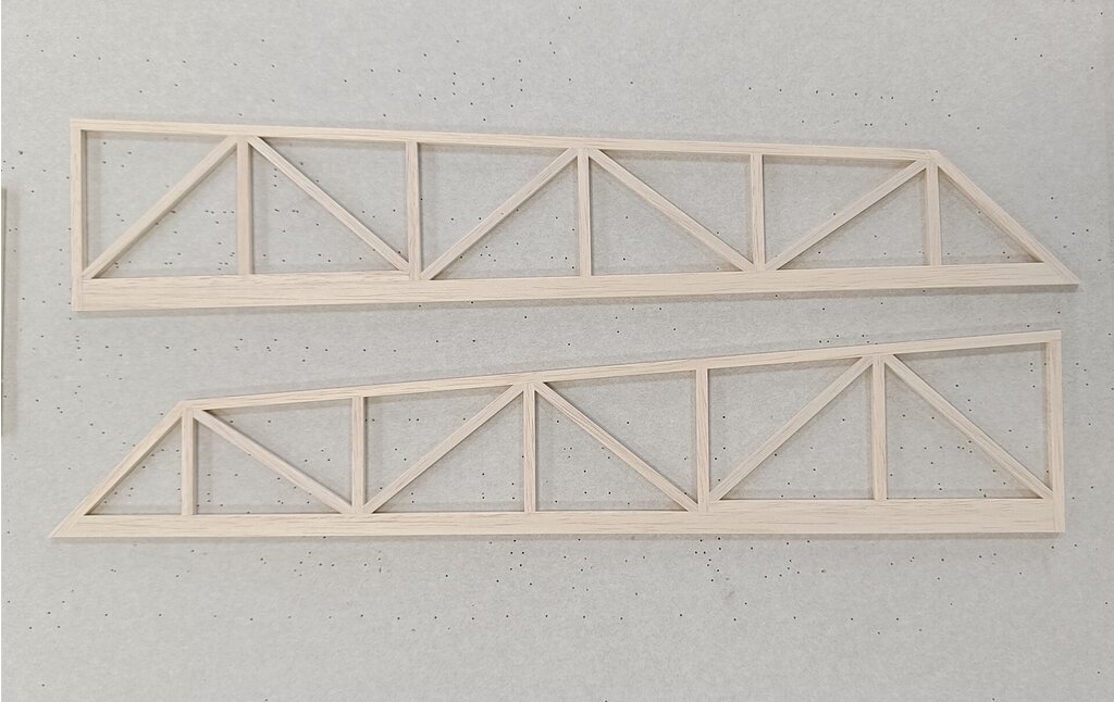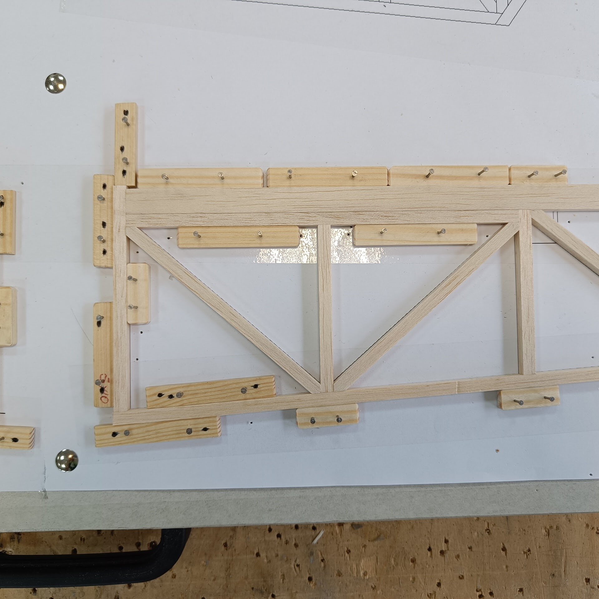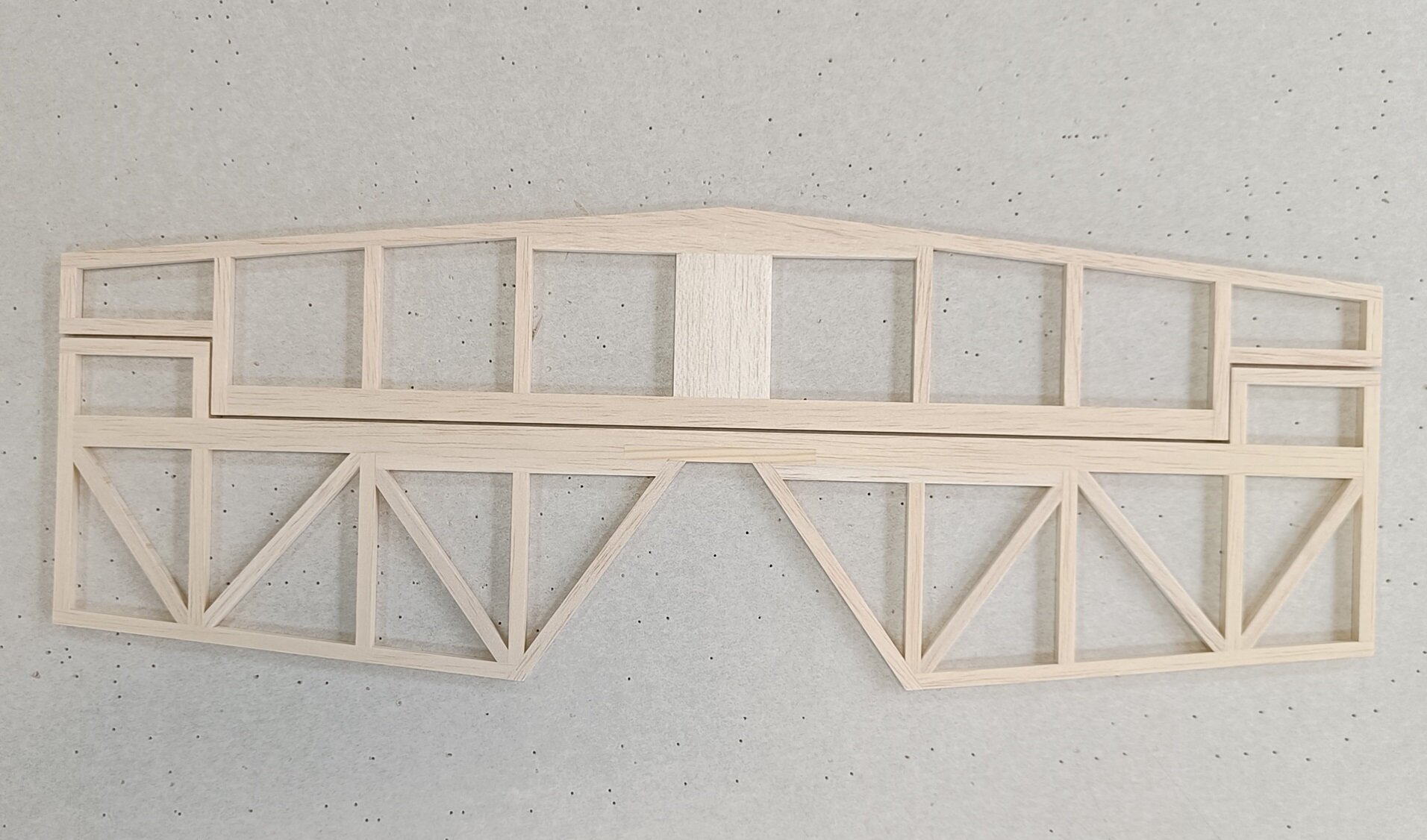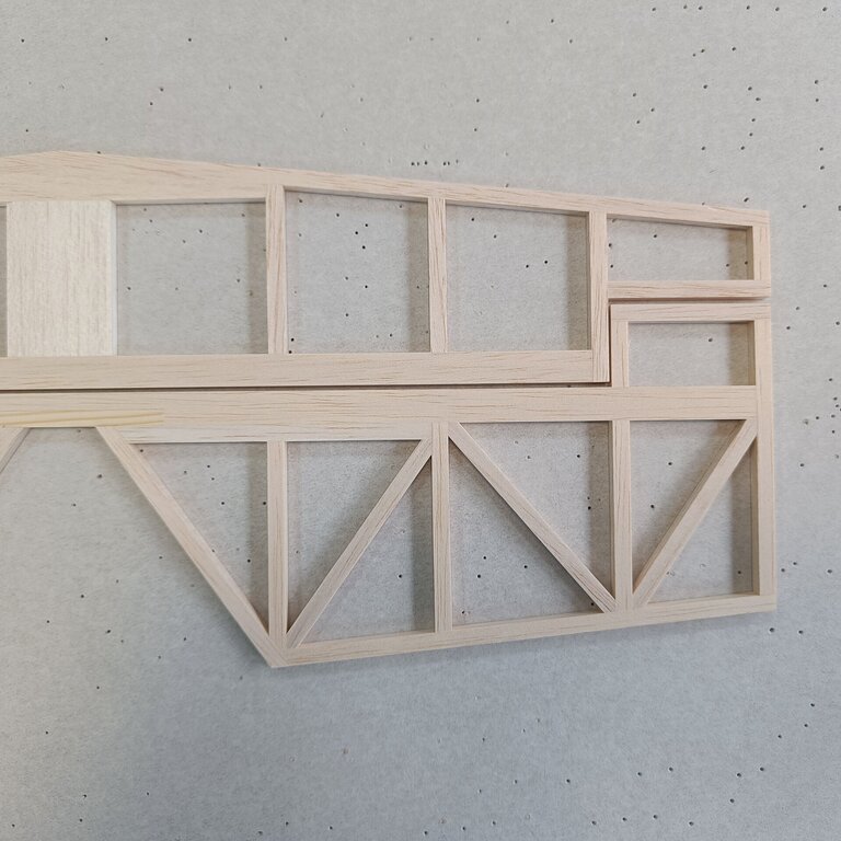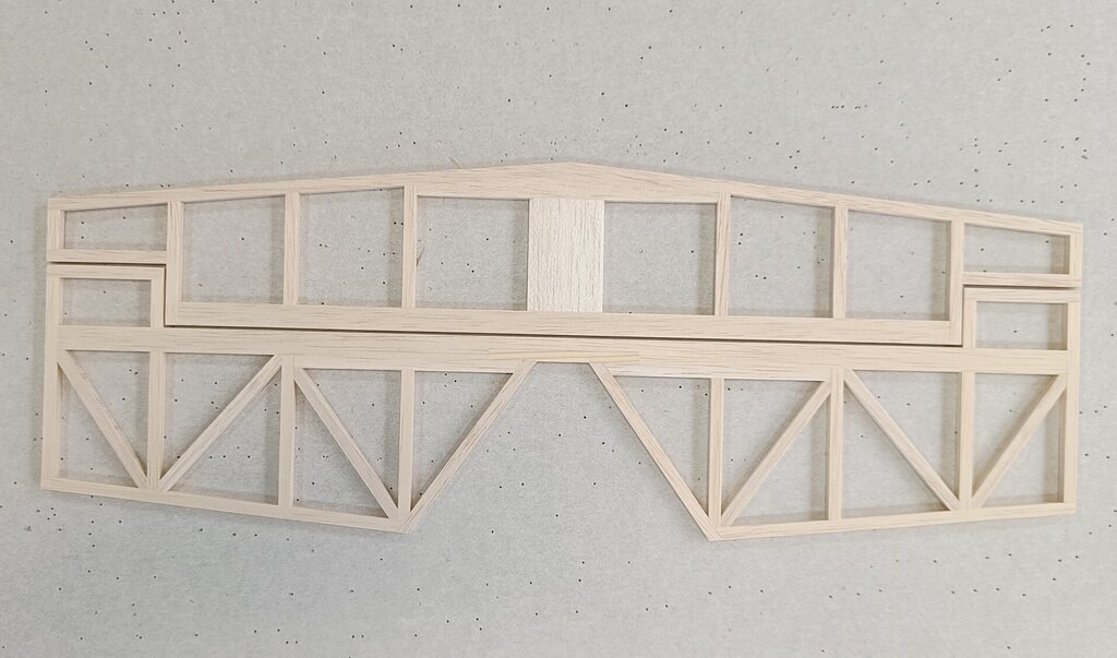 Dzisiaj prosta i przyjemna robota. Jedyne o czym trzeba pamiętać, to wycięcie slotów na zawiasy przed zmontowaniem całości. Dużo łatwiej jest to zrobić w listewce, niż w gotowej lotce. W planach tego nie ma, ale ja dodaję skośne listewki. Używam najlżejszej balsy jaką mogę znaleźć, bo konstrukcja sama w sobie nie wymaga wzmocnienia. Te diagonalne elementy mają tylko ułatwić oklejanie. Ja stosuję folię z Hobbykinga i mam wrażenie, że napręża się bardziej niż Oracover. Podzielenie dużych trapezów na mniejsze trójkąty zmniejsza ryzyko powykręcania, jednak dość delikatnej kratownicy. -