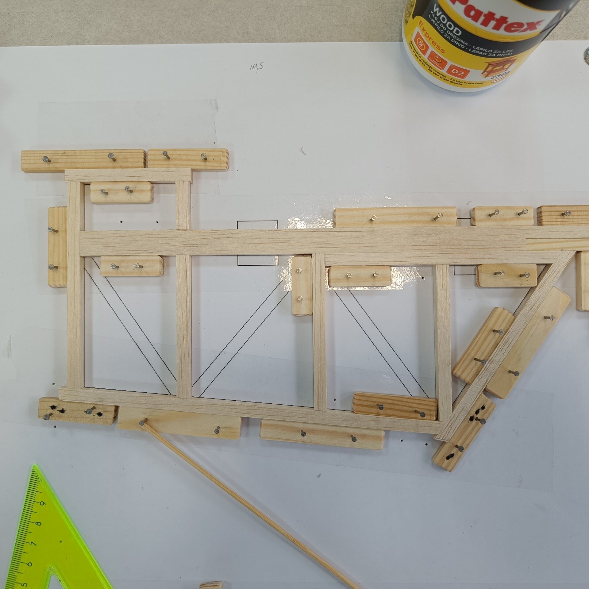 Młody jest, wyrobi się Może nie jest to najczystsza robota, ale widziałem pracę wieloletnich modelarzy, która wcale nie była dużo lepsza. Cięcie tapeciakiem prostych listewek też wymaga trochę wprawy. Ja w ogóle zrezygnowałem z tej metody i tnę wszystko na pile proxxona. Ciężko jednak oczekiwać od piętnastolatka, żeby miał budżet na zakup piły za ~800zł. Ale faktycznie jest na forum dużo relacji z budowy, gdzie można podejrzeć dobre praktyki warsztatowe. Tu problematyczna jest ta dzielona krawędź natarcia i spływu, ale po wklejeniu narożników wystarczy sprawdzić czy całość trzyma się wystarczająco solidnie. Folia termokurczliwa też to wszystko wzmocni. Od siebie dodam prostą i tanią metodę na budowę konstrukcji kratownicowych: - podkład z płyty karton-gips (płaska, tania, dobrze wbija się gwoździe, tapeciakiem można dociąć na wymiar), - folia stretch, folia spożywcza lub przeźroczysta folia samoklejąca na papierowe plany, - bez przebijania szpilkami listewek balsowych, dodatkowe kawałki sosny/balsy do blokowania elementów na miejscu