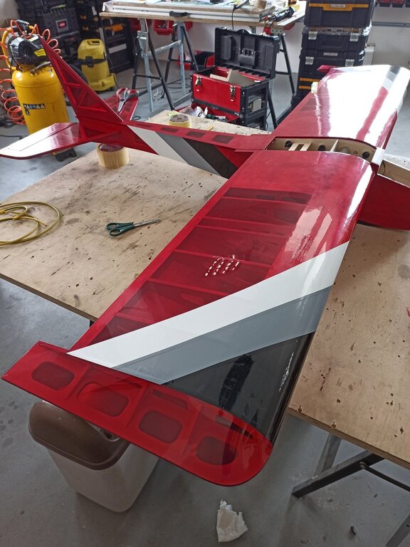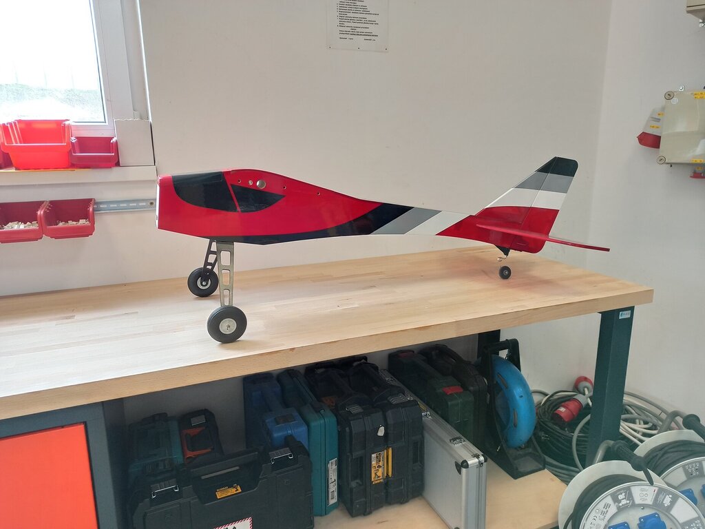 23. Problem ze śmigłem powinno się udać rozwiązać. Śmigła APC są węższe i w najgorszym wypadku potrzebne będzie tylko lekkie zeszlifowanie podstawy kołpaka. Na skrzydłach pojawiły się dodatkowe kolory a kadłub stoi już na kołach Podwozie z duralu pomalowałem najpierw samochodowym podkładem akrylowym. Na opakowaniu było napisane, że nadaje się do aluminium, więc mam nadzieję, że lakier nie będzie odłaził. Z rzeczy do wykonania zostało mi jeszcze wylaminowanie osłony silnika. Później już tylko składanie wszystkiego w całość.