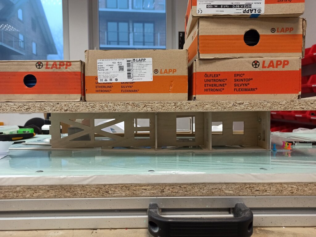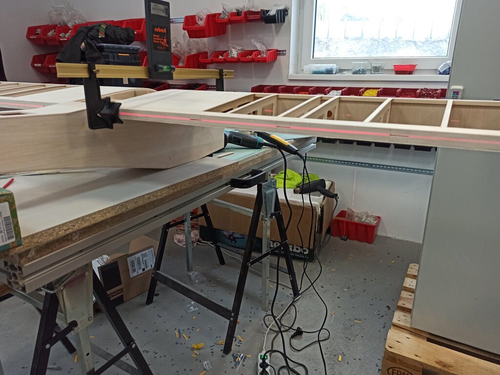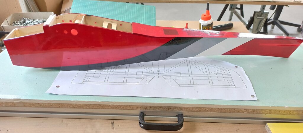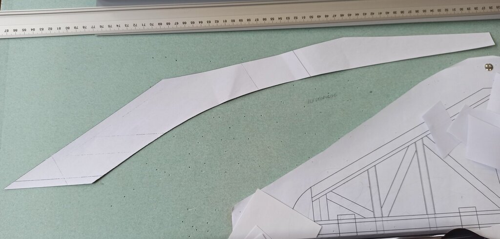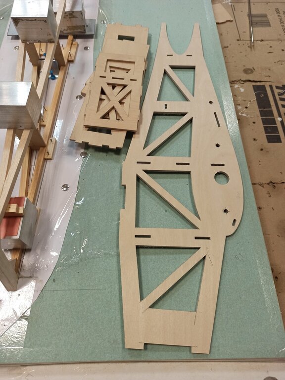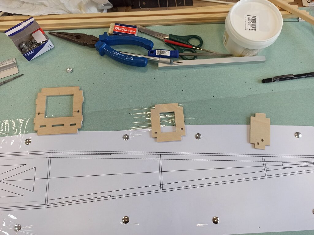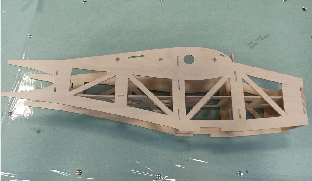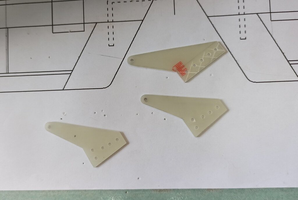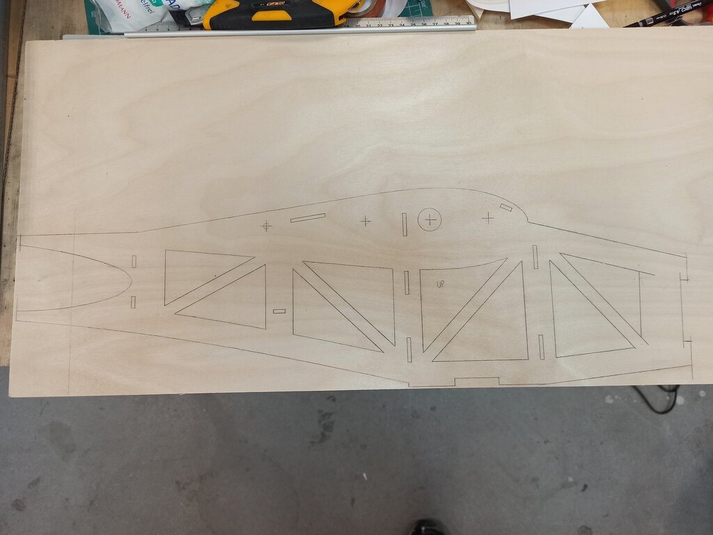 Wracam po przerwie. Tym razem wziąłem się za kadłub. Obrys wręg przenoszę na sklejkę acetonem, a później poprawiam ołówkiem. Kupiłem w tym roku wyrzynarkę włosową, więc wycinanie sklejki idzie całkiem sprawnie. Zewnętrzne krawędzie tnę zwykłym brzeszczotem z drobnymi zębami, a do wewnętrznych wycięć dobrze się sprawdza brzeszczot Proxxona, który ma zęby z każdej strony. W tym tygodniu zdążyłem posklejać tylko część ogonową, domek mam zamiar poskładać w przyszły weekend. Przymierzyłem też prowadzenie bowdenów, dlatego od razu rozwierciłem odpowiednie otwory. Docelowo zastosuję bowdeny gwiadkowe 4/3mm z wymienionym prętem stalowym 0.8mm na 1.5mm.