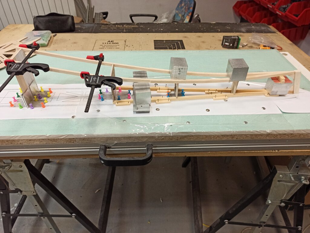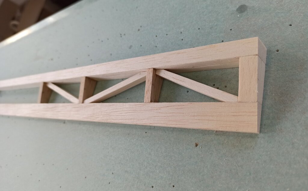 Trochę mi ostatnio brakowało czasu, a trochę też i chęci do składanie modelu. Ale teraz wracam, nie zdążę w terminie konkursowym (buduję tylko w weekendy, a najbliższe będę miał raczej zajęte), jednak relacje powinny się pojawiać aż do ukończenia Wota. Tym razem kilka fotek z mojej techniki warsztatowej. Na tapecie szlifowanie listewek na lotki. Ponieważ nie zawsze udawało mi się utrzymać prostą linię szlifu, zacząłem montować listewki do kawałka płyty z castoramy, żeby jej krawędź stanowiła ograniczenie dla pilnika. Od góry ołówkiem rysuję linię do której zbieram materiał. Najpierw szlifuję po kawałku w kierunku góra-dół, a później przykładam pilnik płasko i przesuwam kilka razy w prawo i lewo żeby dodatkowo wygładzić powierzchnię. Krawędź płyty daje dobry punkt podparcia dlatego łatwiej utrzymać papier ścierny w jednakowej pozycji. W miarę szlifowania przesuwam też ściski, żeby listewka była solidnie przytwierdzona w aktualnie obrabianym fragmencie. Tak się prezentują już posklejane elementy: środkowa część będzie jeszcze uzupełniona o grubszy kawałek balsy, do którego zamontuję ramie popychacza.