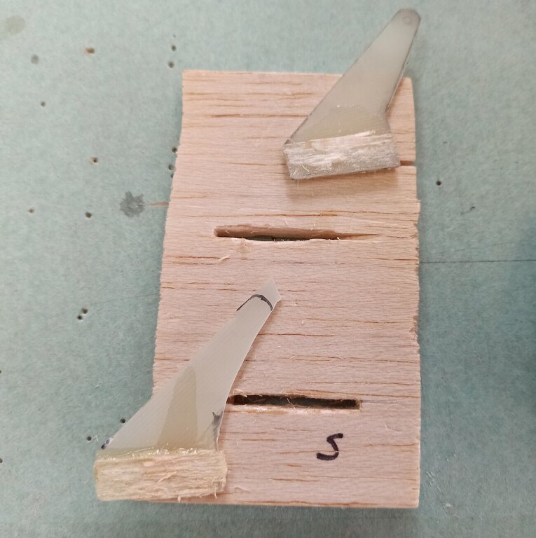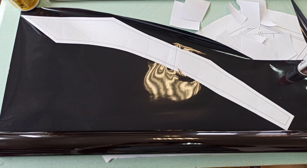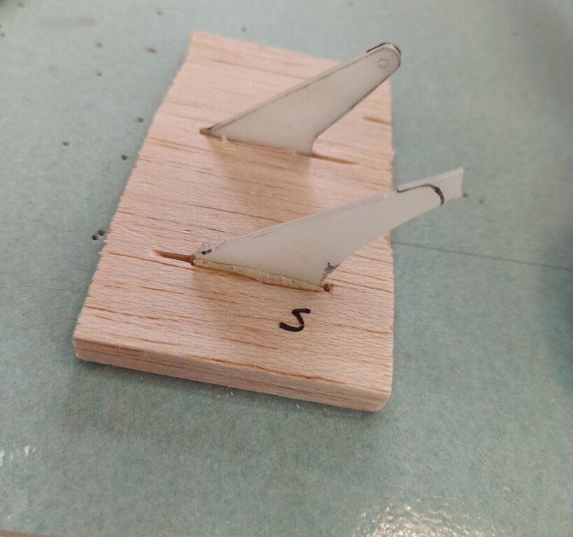 Z laminatu szklanego powycinałem dźwignie sterów. Używam płyty o grubości 1.5mm. Przymiarka na sterze kierunku i lotce. Do tej pory wklejałem dźwignie na żywicę epoksydową. Tym razem przygotowałem sobie małe stanowisko testowe do porównania żywicy i soudalu. Obie oczywiście udało mi się wyrwać (tym bardziej, że użyłem miękkiej balsy), ale wymagało to sporej siły. To tylko subiektywne odczucia, ale soudal trzymał lepiej. Nawet na drugim zdjęciu widać, że mocniej się "wgryzł" w materiał. Model dostał też trochę koloru. Do nieregularnych kształtów użyłem samoprzylepnego papieru, który wrzucam na drukarkę, a później przyklejam na wewnętrzną stronę folii i po wycięciu usuwam razem z tą przeźroczystą warstwą chroniącą klej. Wyszło całkiem dobrze. Na pewno lepiej niż odrysowywanie szablonów markerem. Do oklejania stosuję folię z Hobbykinga. Stosunek ceny do jakości jest bardzo dobry. 5 metrów kosztuje tyle samo co 2 metry Oracoveru. Czasem problemem jest natomiast dostępność w europejskim magazynie. W porównaniu do Oracoveru powiedziałbym, że chińska folia mocniej napręża i przy odklejaniu potrafi zostawić więcej śladu. Ale dość dawno pracowałem z Oracoverem, więc może mi się tylko tak wydawać