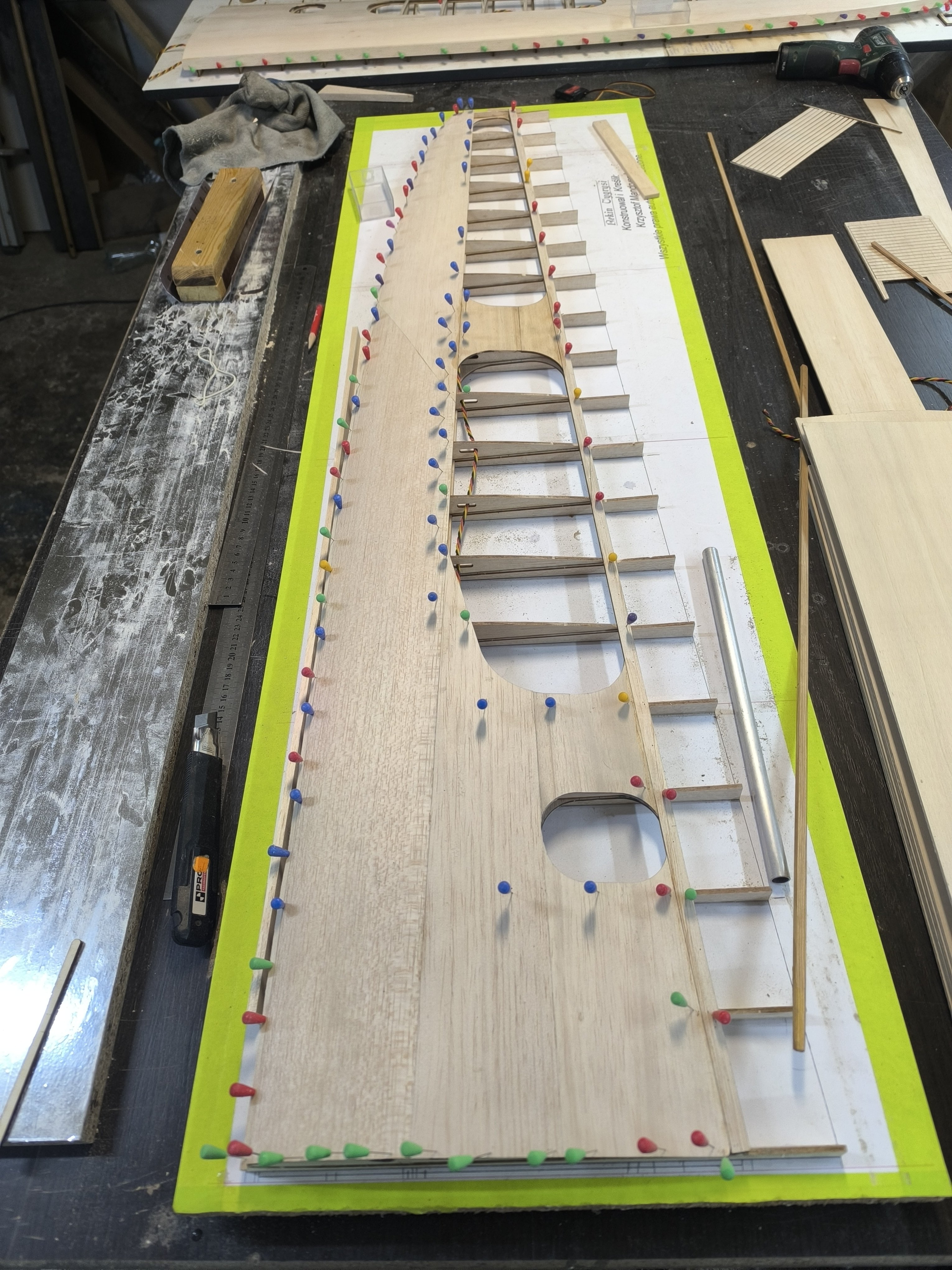 Mała aktualizacja. Zacząłem montaż skrzydeł, wkleiłem większość żeberek, dorysowałem i wyciołem laserem wstawki między dźwigary i wkleiłem, muszę jutro skoczyć po rury na bagnety. -