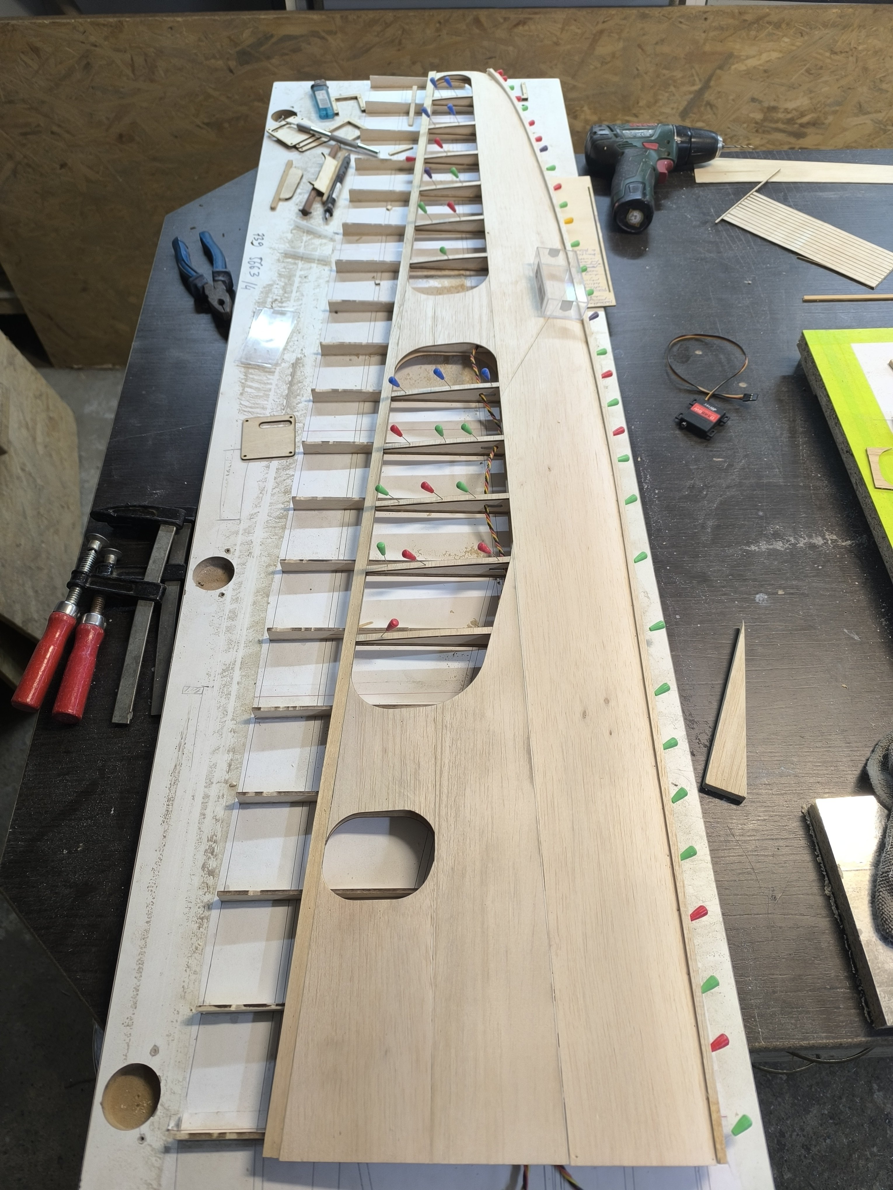 W drugim skrzydle udało się pokrycia wkleić, w pierwszym wkleiłem natarcie i wypaskowałem. To wszystko miedzy czasie jak laserem wycinałem dla jednego kolegi dużego Decathlona. Jutro ciąg dalszy. -