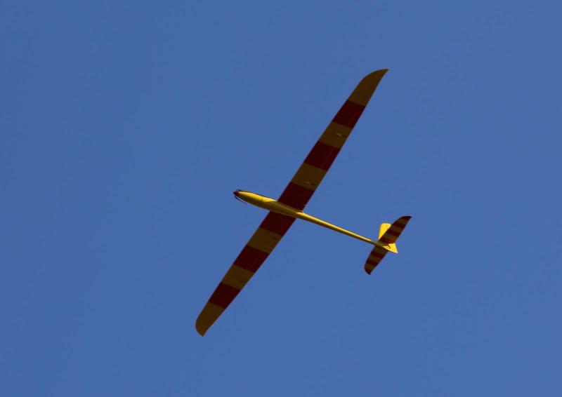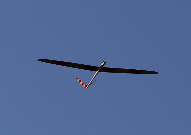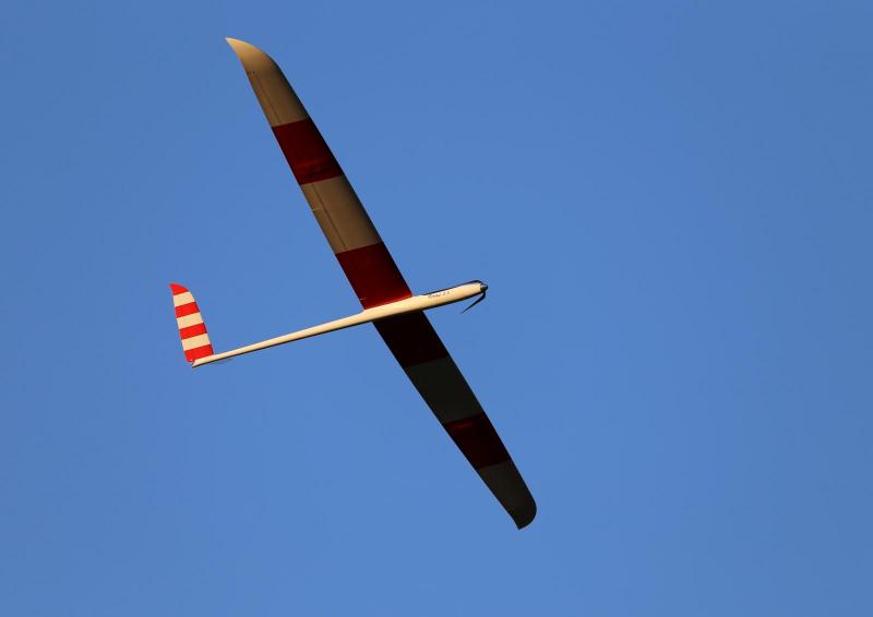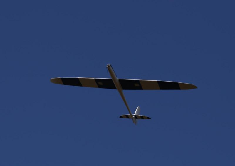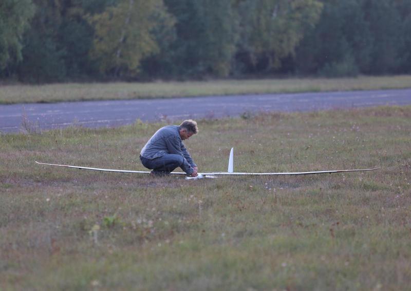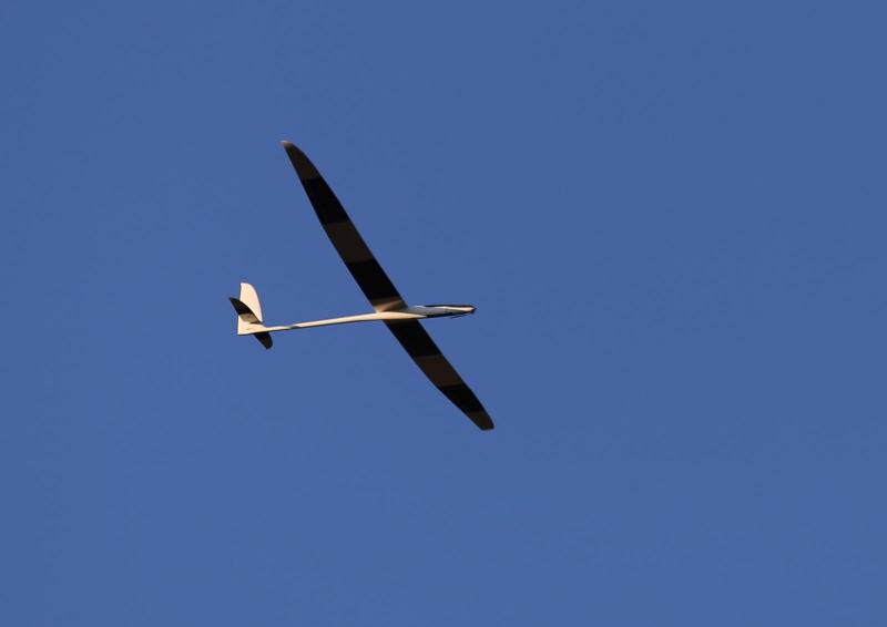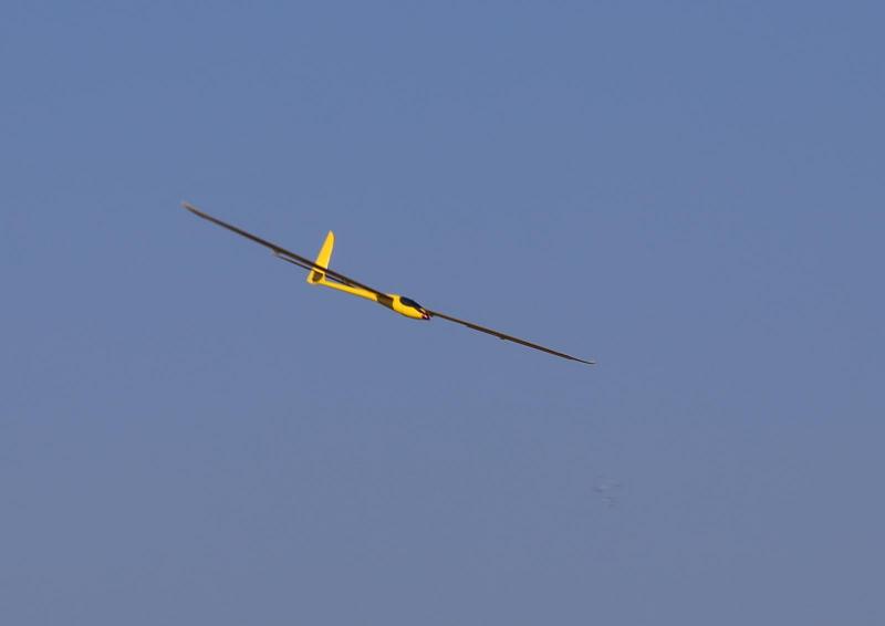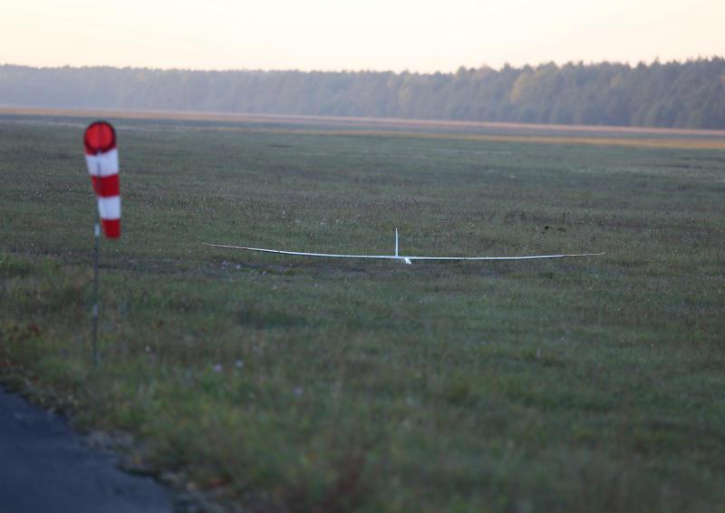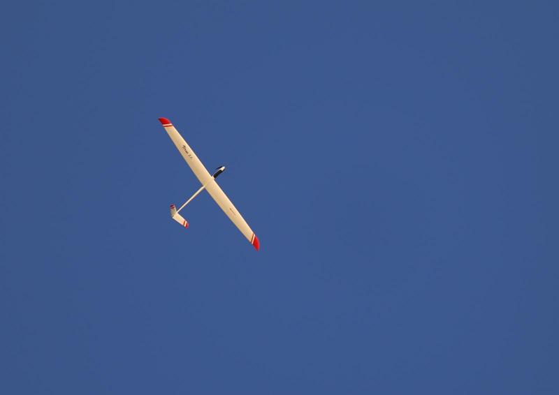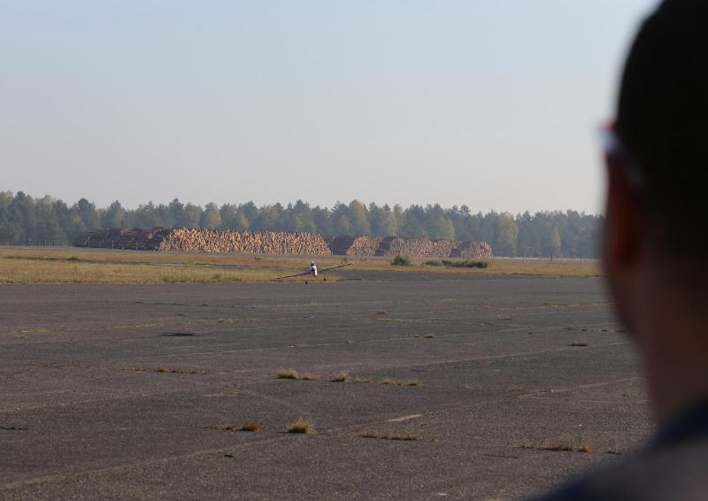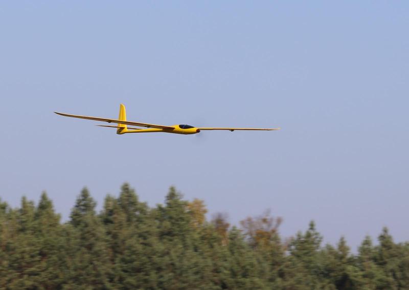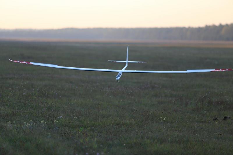 Chwilę polatałem. Lądował Sławek. Tak z ciekawości chciałem zobaczyć jak lata. Dużo 'różnych ciekawych' rzeczy czytałem na temat modeli tego producenta …. Chciałem przekonać się na własnej skórze ... Dużo zależy od ustawień modelu jak i nadajnika … Tak po kilku minutach kręcenia ósemek mogę powiedzieć, że model lata bardzo lekko, czuć tą lekkość w powietrzu w pozytywnym tego słowa znaczeniu. Równocześnie zadziwiająco dobrze trzyma sie powietrza w trudnych turbulentnych warunkach. Jest to juz dość stara konstrukcja ale naprawdę daje rade. Bardzo uniwersalny model. Model bardzo poprawnie czyt. schludnie wykonany w przeciwieństwie do Whisper'a, modelu naszego Kolegi, który musiał dużo pracy włożyć aby model 'wyglądał'. Brakuje mi troche węglowego, skrzynkowego bagnetu co by bylo można tam co nieco włożyć. Generalnie bardzo pozytywne wrażenie.