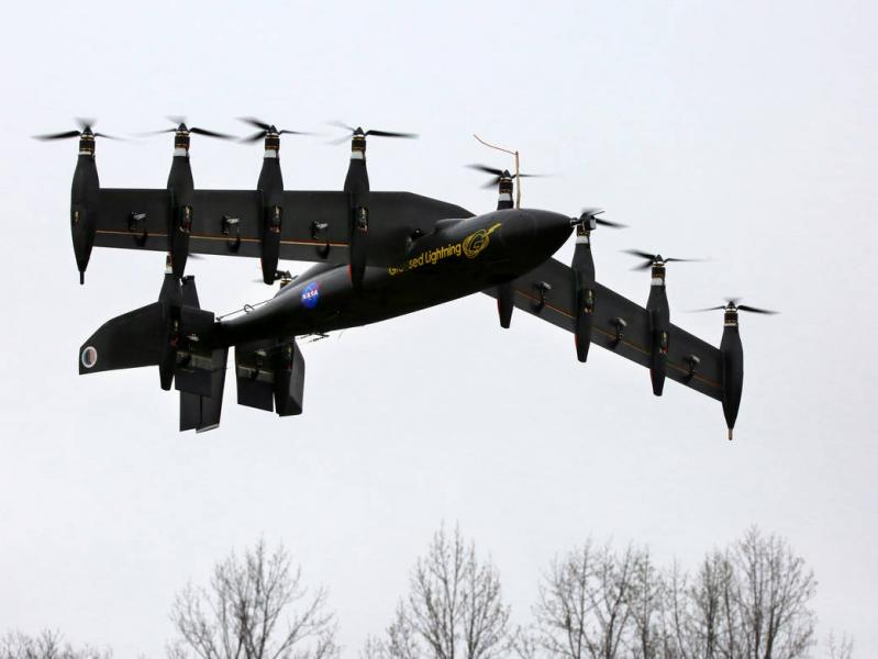 Zespół Langley Research Center NASA opracowuje koncepcję samolotu na baterie , który ma 10 silników i może latać jak helikopter i jak samolot . Prototyp , zwany Błyskawica lub GL- 10 , jest obecnie w fazie projektowania i testowania . Początkowo miał mieć rozpiętość skrzydeł 6,1 m. Samolot napędzany jest hybrydowym diesel / silniki elektryczne , ale zespół rozpoczął mniejsze wersje do testowania.Samolot pilotowany zdalnie ma rozpiętość skrzydeł 3,05 m , osiem silników elektrycznych na skrzydłach , dwa silniki elektryczne na ogonie i waży maksymalnie 28,1 kg . Na zdjęciu prototyp GL- 10 startuje w trybie hover jak helikopter .