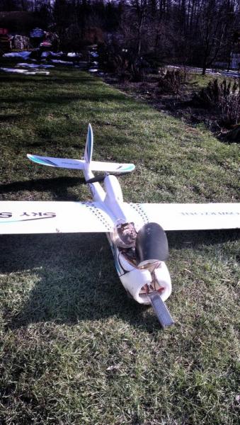 Dzisiaj to już go uśmierciłem totalnie. Kadłub pękł na pół. Nie wiem co źle robię przy starcie: 70% gazu Mocno wyrzucam pod lekkim kątem w górę Model przechyla się w w lewo i dziób w dół i kret 4 razy tak zrobiłem i nie widzę możliwości już poskładać wraku... szukam więc części zamiennych