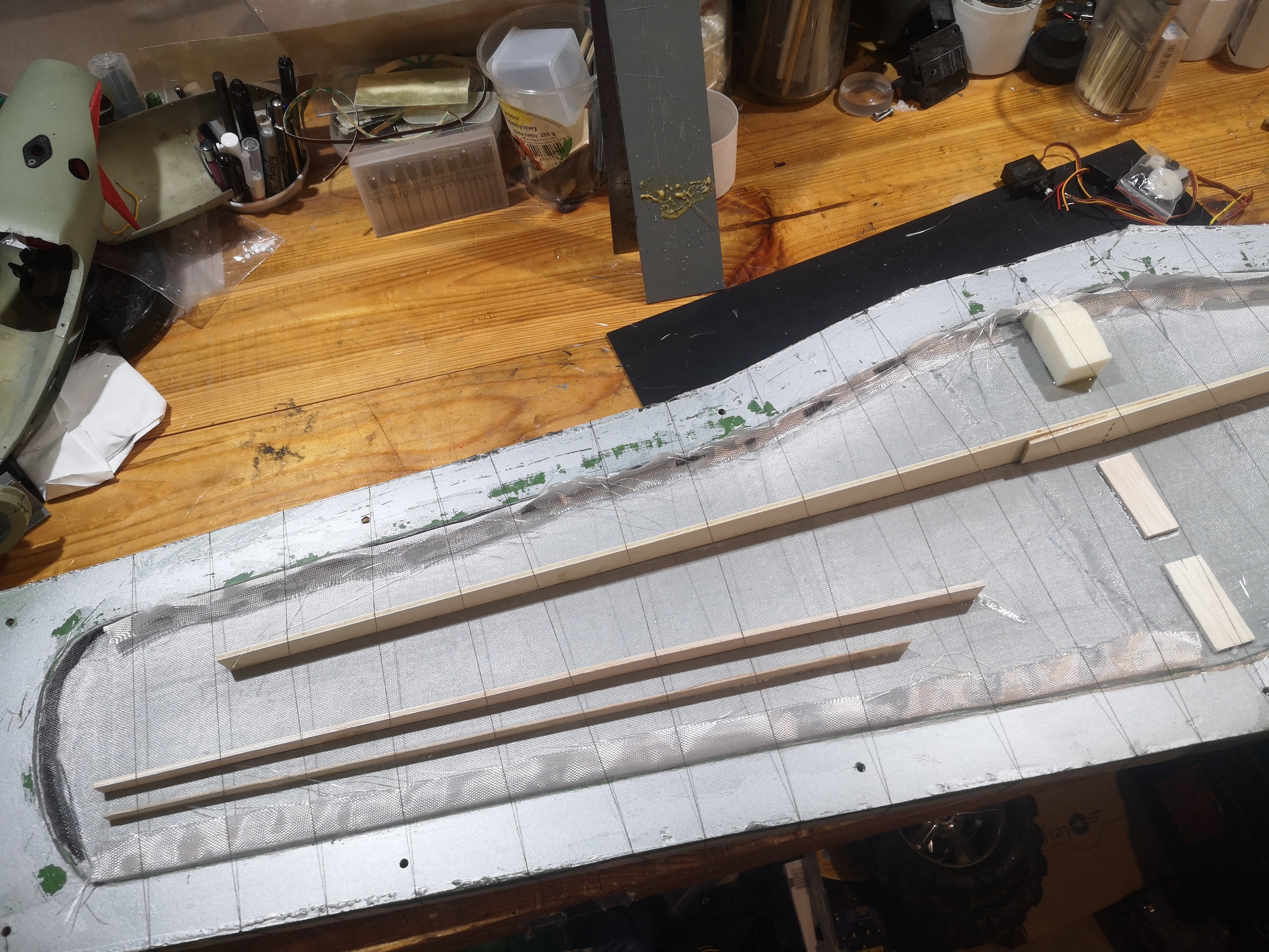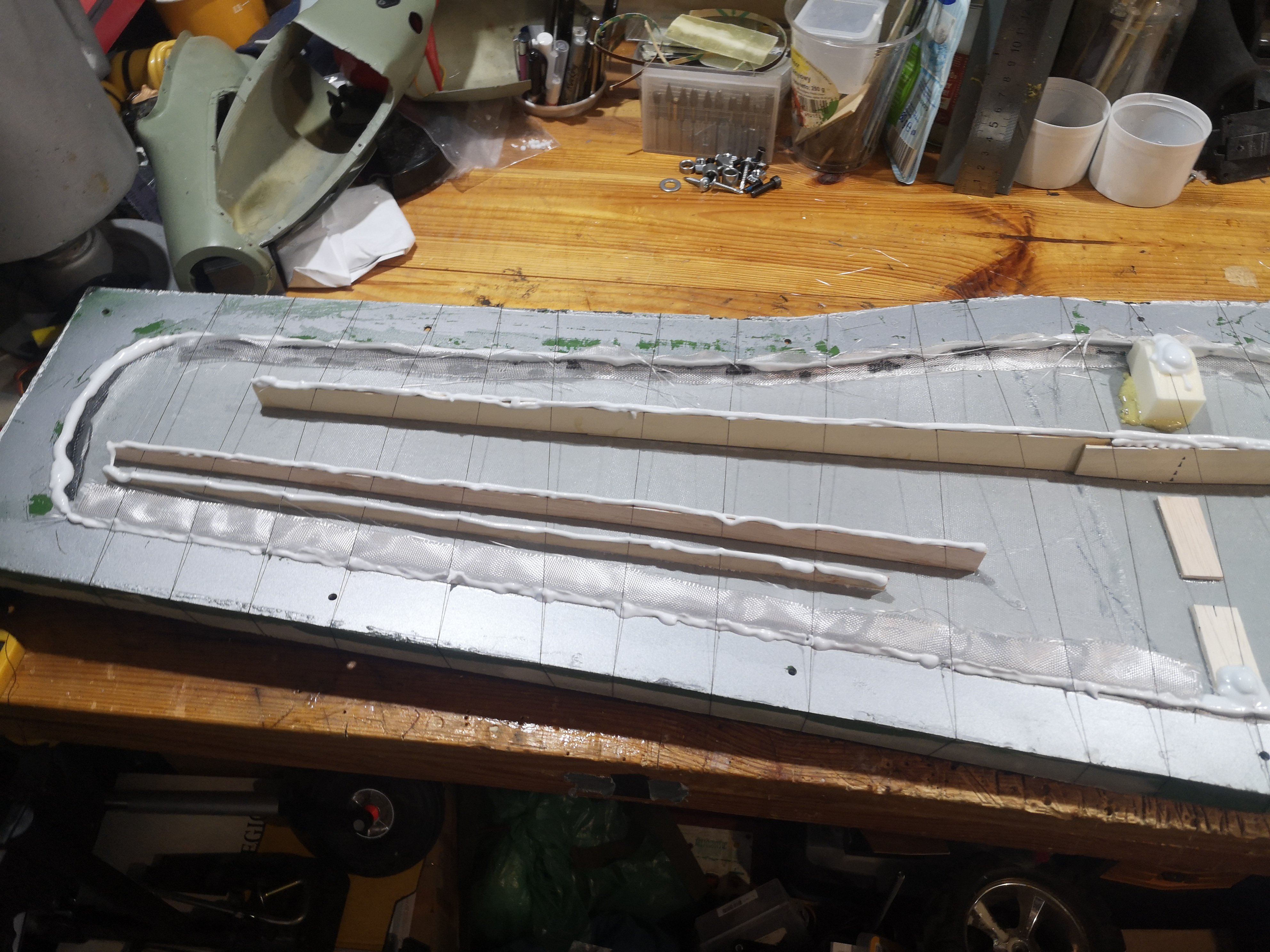 Hej... Tak na szybko...tkanina 2x80g/m2, na natarcie rowing węglowy by wygładzić zawijas natarcia. Jest to pancerne rozwiązanie, ale to prototyp. W następnym będzie 1x45g/m2 I 1x80g/m2. Po ułożeniu, odsaczam żywice ręcznikami papierowymi. Jutro, będę montował dźwigary i twarde punkty. Skrzydłami tej konstrukcji w Mustangu bojowym, fizycznie wyeliminowałem 4 samoloty i dopiero gdy odmówiło działania jedyne pozostałe serwo (bo drugie wypadło po 2 kolizji) przyziemiłem awaryjnie...