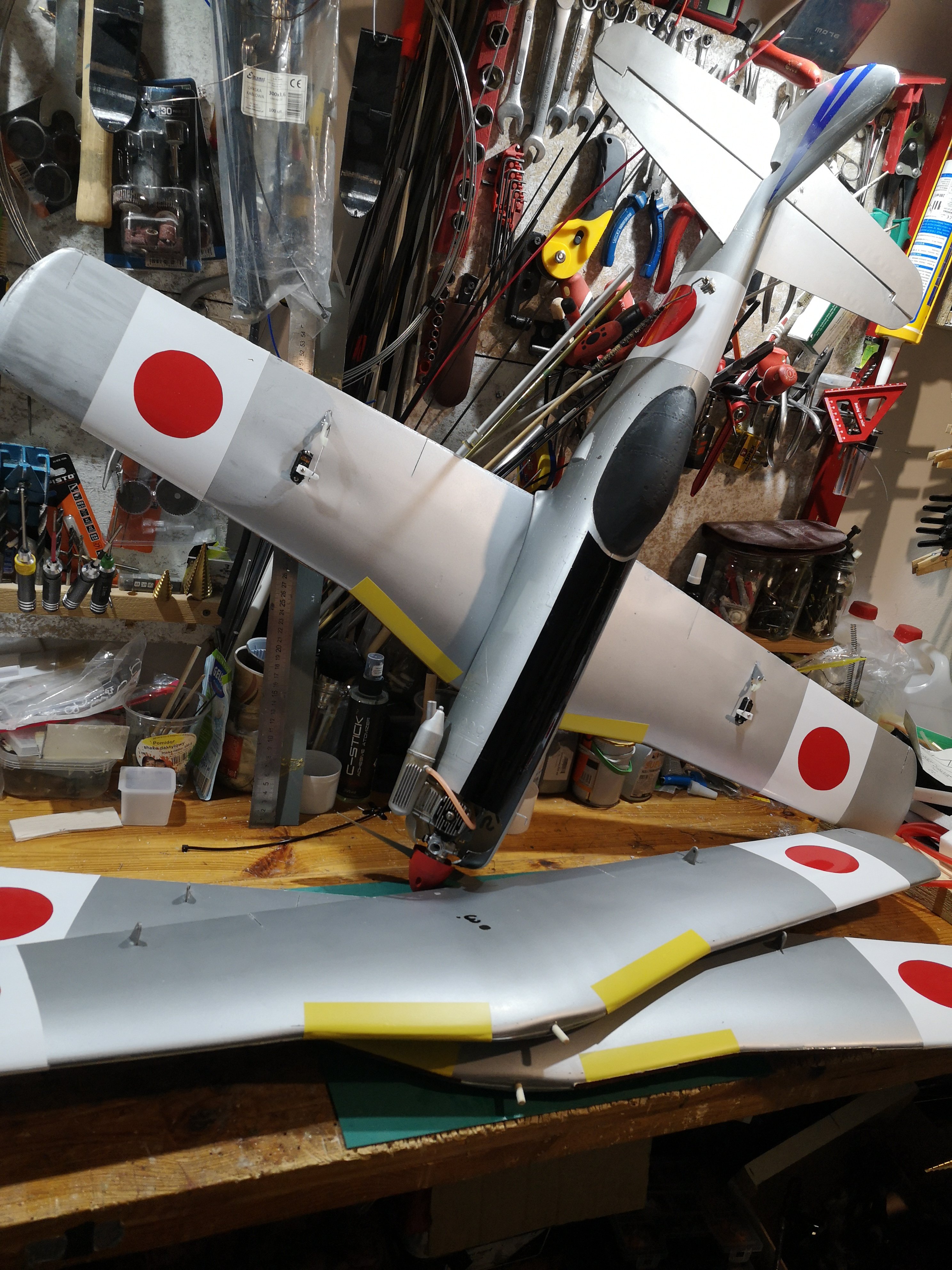 Weekend dobiega końca, a mi udało się troszkę podłubać przy Japończyku. Rozformowałem skrzydła, nie wyszły idealnie gdzieniegdzie pouciekało łączenie z mikrobalonów. Następnym razem zastosuje metodę na nitkę. W tej wersji zastosuje mocowanie skrzydeł na plastikową śrubkę. Powycinałem również pełen zestaw oznakowań z folii samoprzylepnej. Na skrzydle widać plamę bo wpadłem na genialny pomysł odtłuszczenia zmywaczem do hamuleców. Niepolecam....