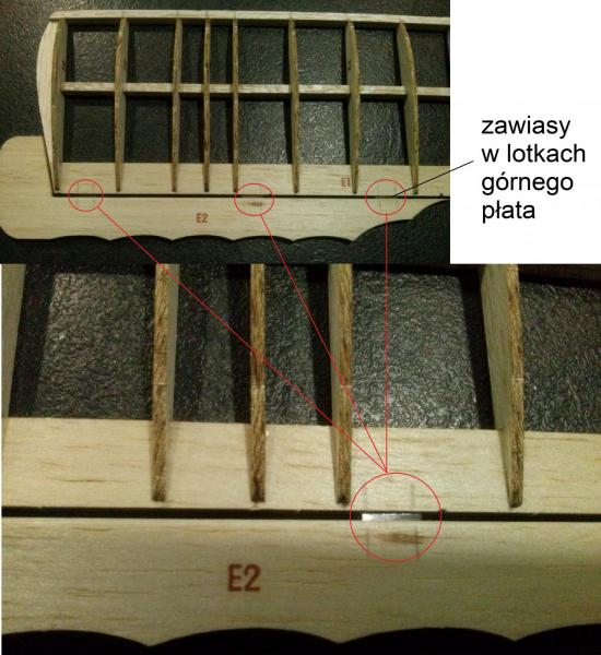 Witam, kolejny etap budowy w fotkach. Trochę wolno mi to idzię..., no ale idzie. Zamontowałem lotki wpuszczając zawiasy w listewkę fota nr 1. Jednak tak jak pisałeś Piotr nie znalazłem uzasadnienia cięcia lotek, więc ich nie ciołem. Zastanawiam się nad napędem lotek, rozwiązanie "torque rods" jak pisałeś, lub mocowanie tego elementu prostopadłego do lotki - fota nr 2 (nie wiem jak się nazywa). To drugie rozwiązanie chyba było w orginalnym Fokkerze. Nie wiem które będzie lepsze. fota nr 1 fota nr 2 znalazłem miedzy innymi takie rozwiązanie napędu lotek, i takie i jeszcze parę fotek