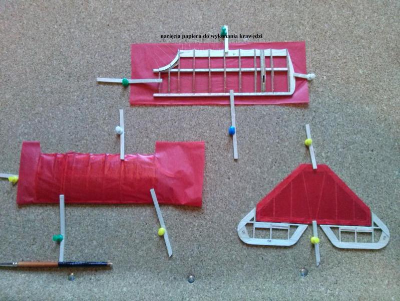 Myślałem o pokryciu folią termiczną ale z obawy przed przeciążeniem zdecydowałem się na japonke. Co prawda brałem pod uwagę inny rodzaj foli (oracover), trochę cięższy ale się wystraszyłem, że brak żelazka modelarskiego i opalarki lub porządnej suszarki (o większej mocy niż ta która jest w domu) znacznie utrudni oklejanie . Może przy kolejnym projekcie spróbuje powalczyć z folią. Wbrew moich obaw przed japonką nie jest tak źle, tyko ten smród. Po prosu więcej pracy i hartowanie cierpliwości.