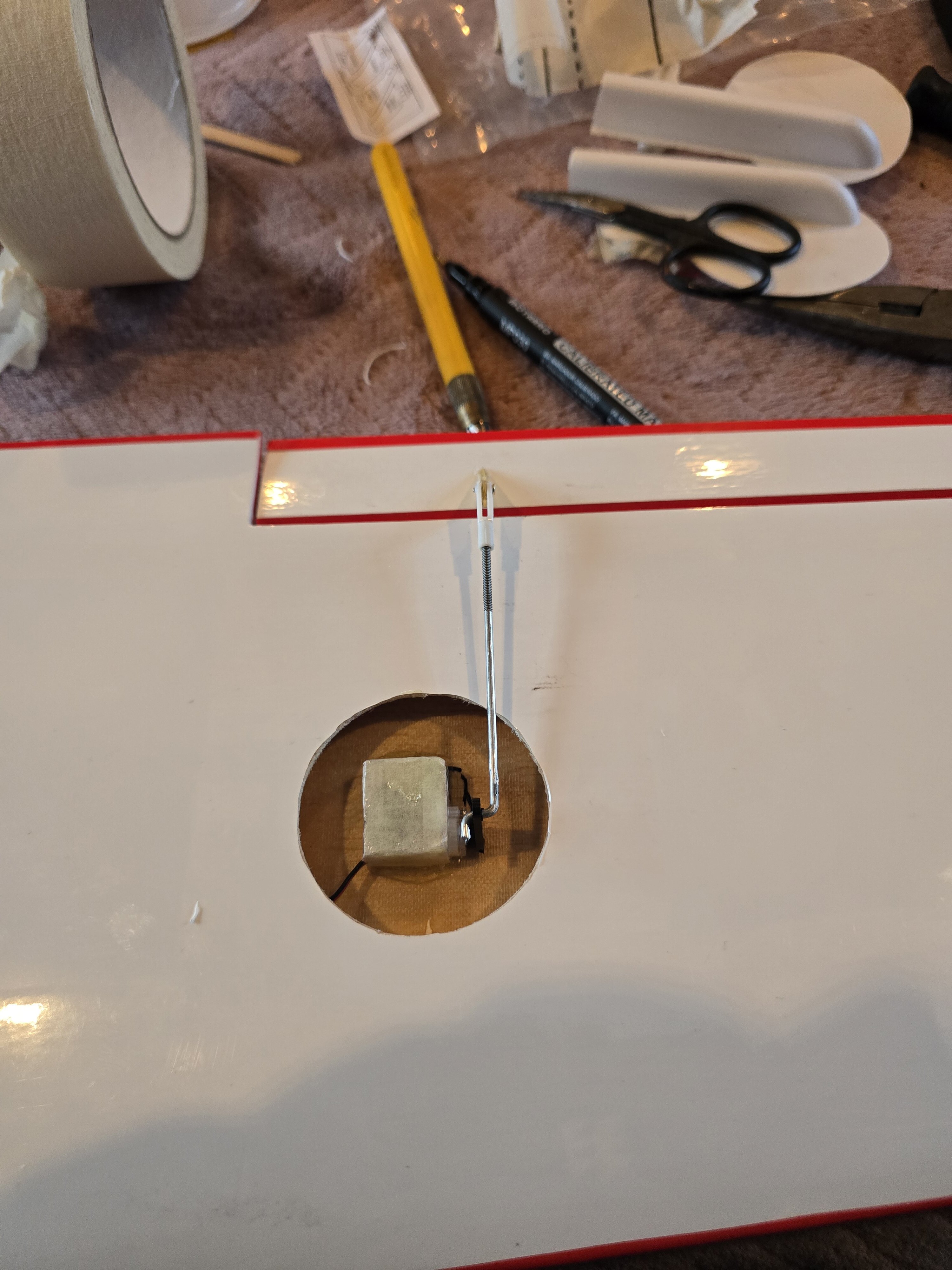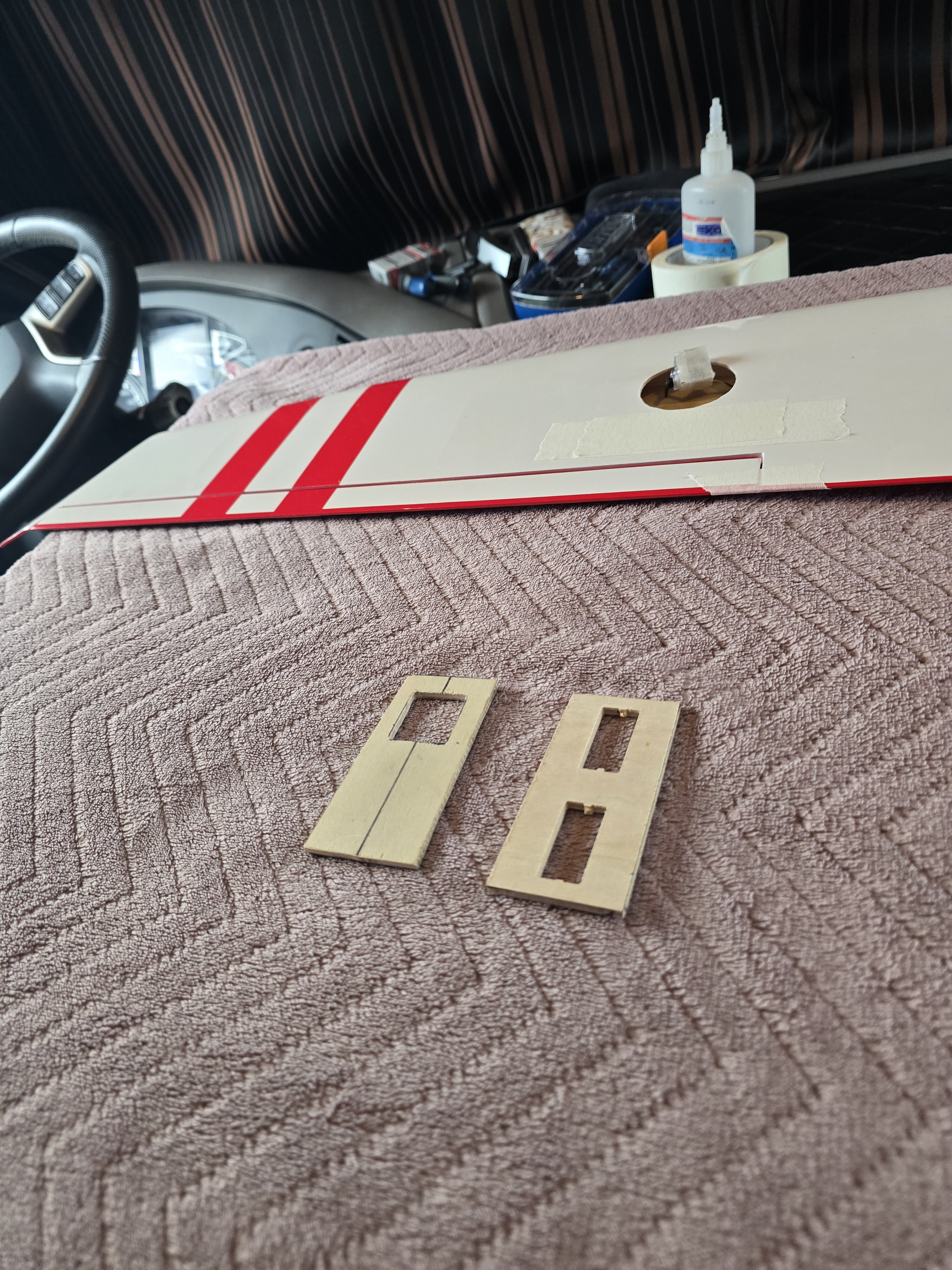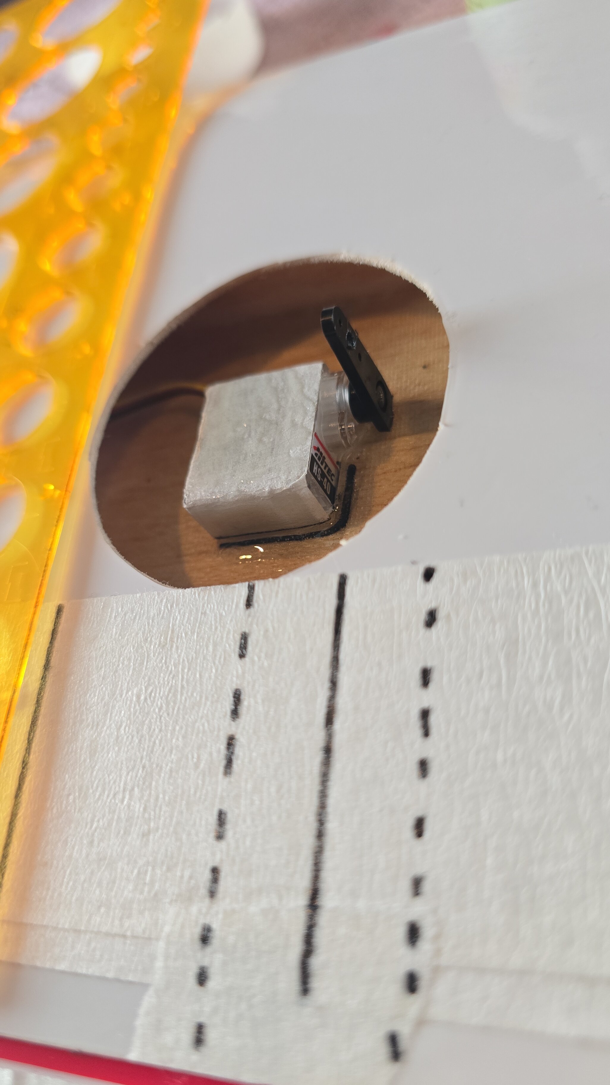 wyciąłem nową półkę pod serwa. Montaż serw w skrzydła. No to teraz dzwigienki na zywicy 5min. Jak wyschnie to cięgna.