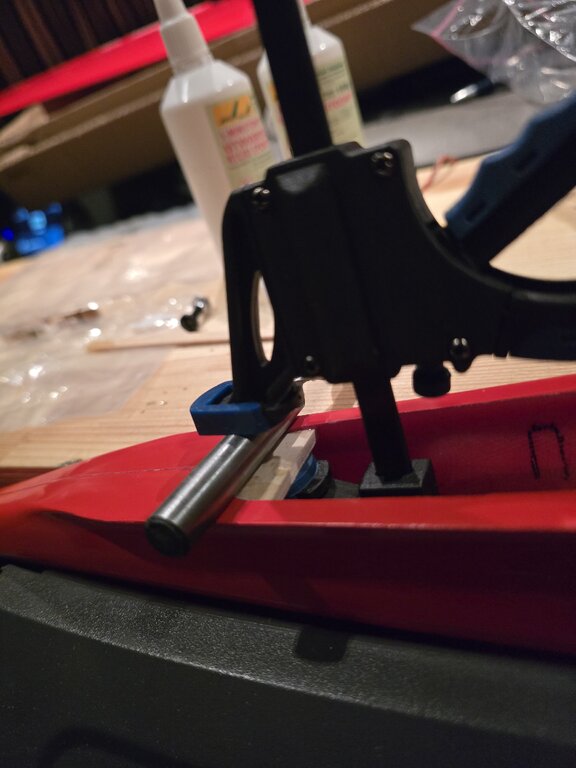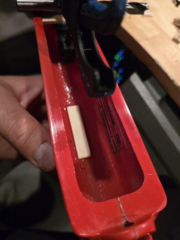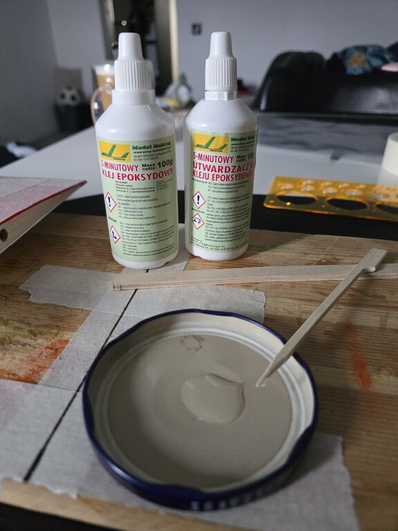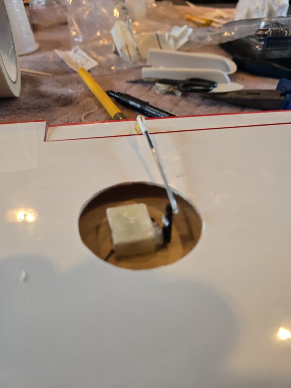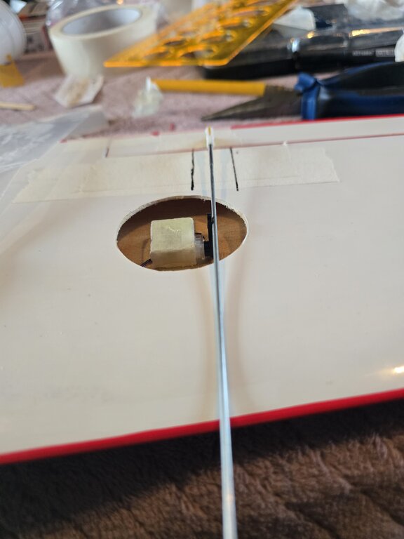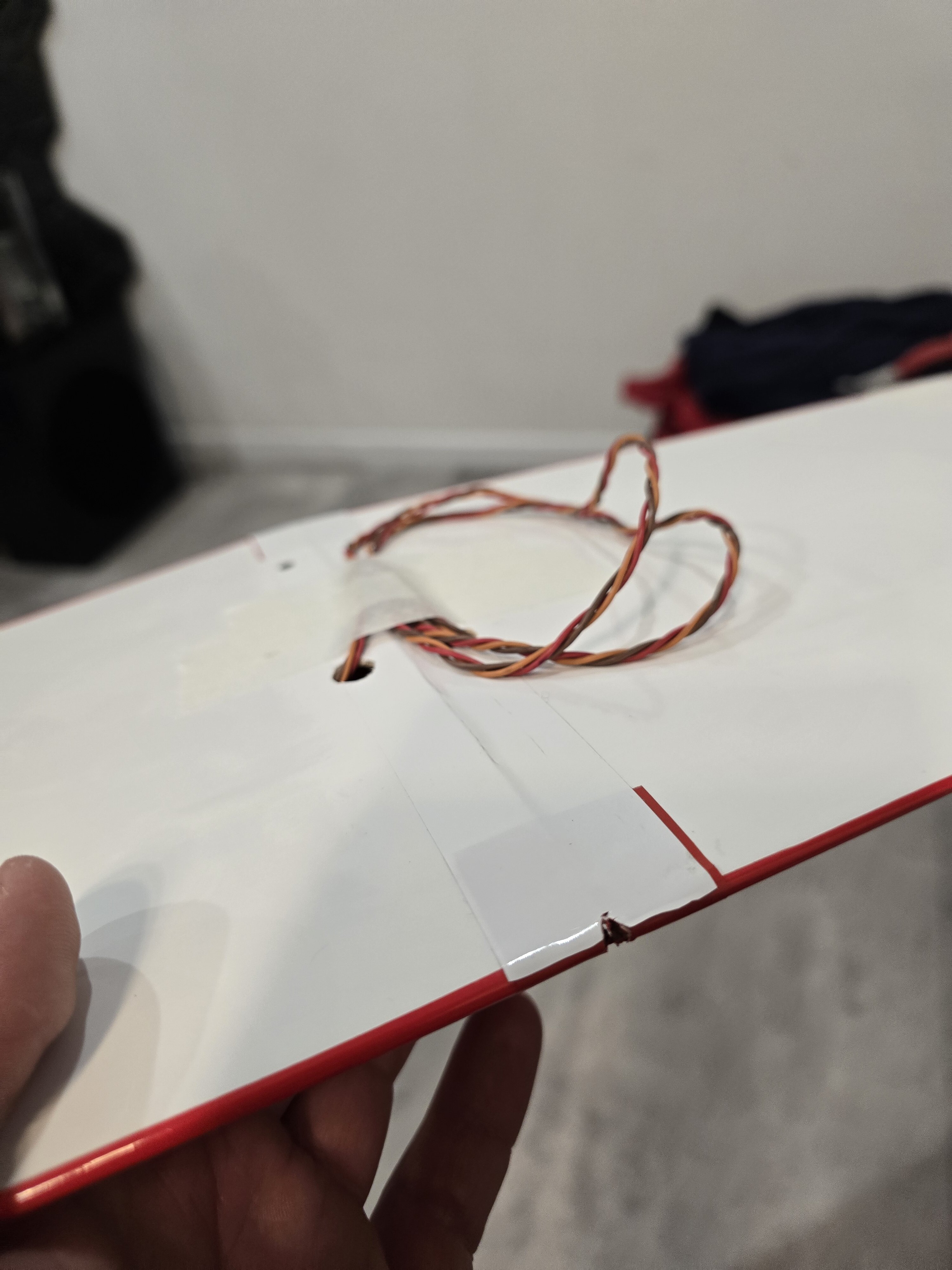 wyciąłem nową półkę pod serwa. Montaż serw w skrzydła. No to teraz dzwigienki na zywicy 5min. Jak wyschnie to cięgna.