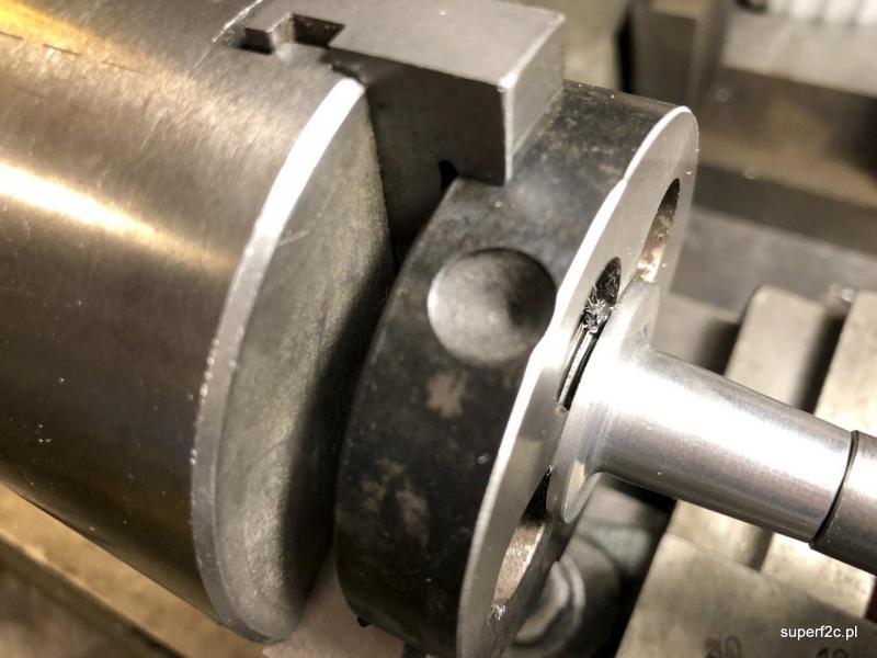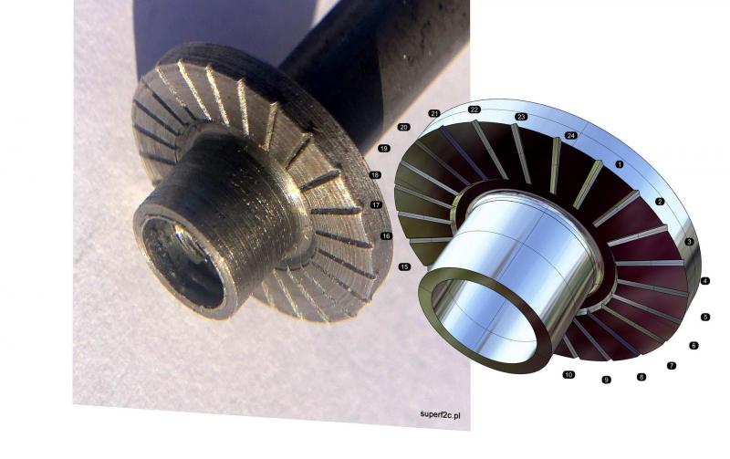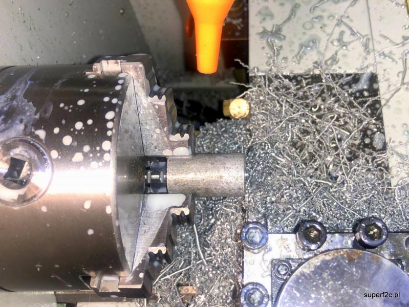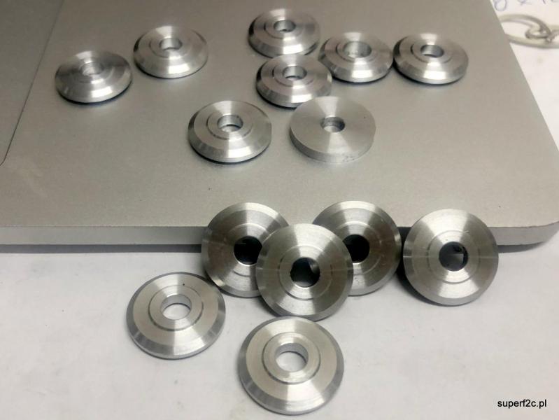 to trochę nie tak bo jak fachowiec któremu oddaję do napawania czy zespawania widzi jakie ma zadanie i stosownie dobiera na przykład same parametry spawania jak i rodzaj gazu obojętnego. Materiały do napawania laserowego i spawania impulsowego są dobrane z uwzględnieniem rodzimego materiału. Możliwe jest również odpowiednie dobranie drutu zgodnie ze składem chemicznym lub twardością naprawianych elementów. Istotnym elementem doboru drutów jest wiedza na temat dalszego procesu technologicznego tj. tego, czy nastąpi azotowanie, trawienie lub hartowanie. Ostatnio jak czegoś nie miał a było potrzebne to po prostu odebrałem po dwóch tygodniach. Zatem rodzajów drutu do podawania jest tyle ile rodzajów materiałów. Ważne że tokarka dzisiaj i wczoraj wyprodukowała kilkadziesiąt sztuk podkładek do śmigła... Więcej stała niż pracowała w oczekiwaniu na operatora aż raczy wysunąć do zderzaka kolejny kawałek wałka fi20 z uchwytu tokarskiego i naciśnie ikonkę "start cycle" Na gotowo !!! Z fazami na wszystkich krawędziach. Sama na gotowo. Szkoda tylko że sama sobie nie podaje następnego materiału... Bo jak sam proces całego cyklu toczenia trwa nieco ponad 4 minuty to praktycznie ciągle trzeba być przy tokarce. I niczym innym konkretnym nie mogę się w tym czasie zająć... Dwie sztuki widać tutaj odwróciłem co by pokazać drugą stronę. -