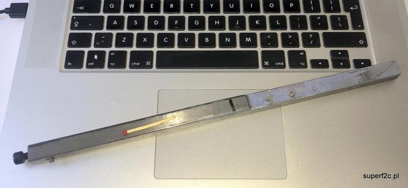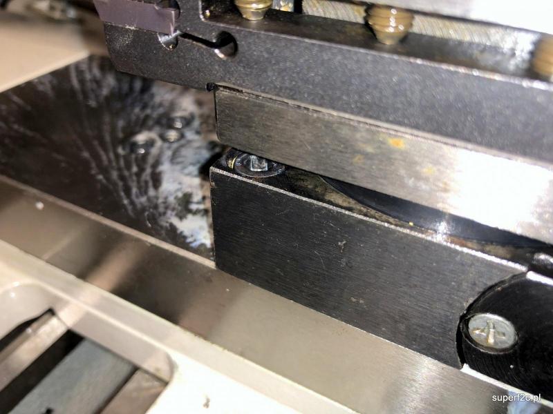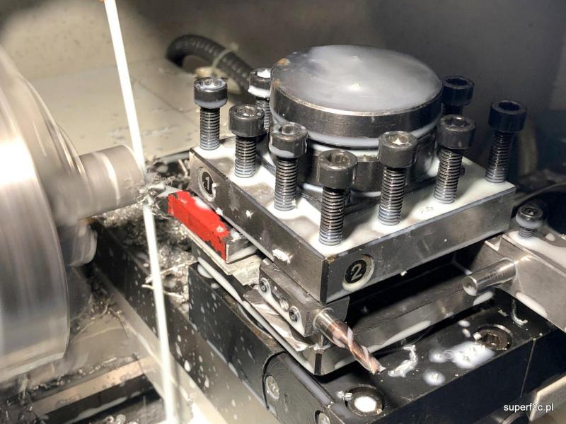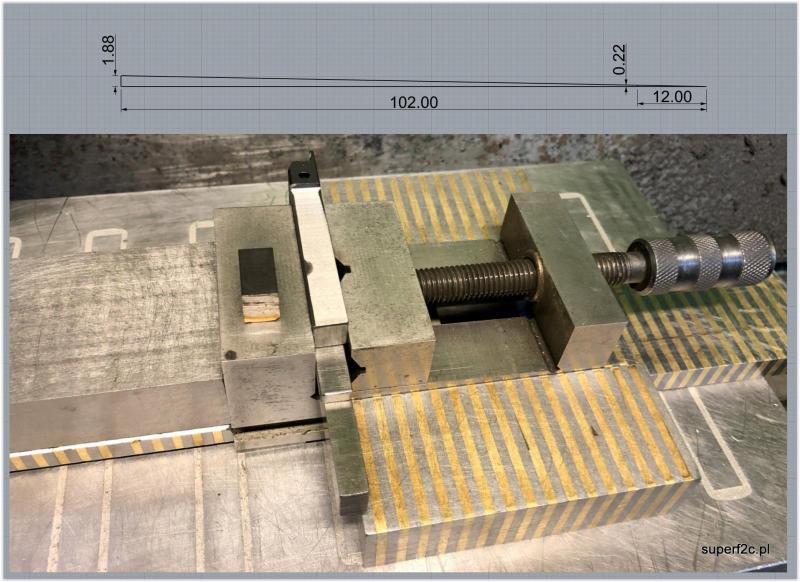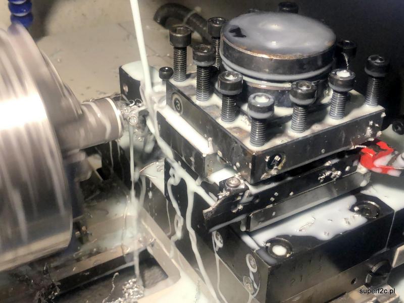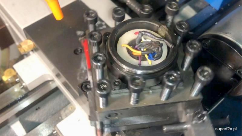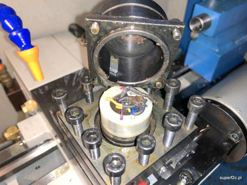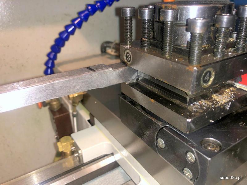 i dalej nie wiem jak rozkręcić imak z racji braku dostępności mocujących śrub które są schowane bezpośrednio pod imakiem. Czyli jak zwykle do tej pory. Gotowe noże z wymiennymi płytkami zakupione w necie po prostu modyfikuje czyli zbieram 0,22 milimetra na 12 milimetrach. co by nóż przecinak stał prostopadle do przecinanego materiału. Proste. Tylko że ten modyfikowany nóż już do normalnej tokarki się nie nadaje... na szlifierce na płasko ze stołem magnetycznym ustawiłem imadełko szlifierskie podkładając z odpowiedniej strony podkładkę 1.88 którą doszlifowałem wyliczając zbieżność 0,22/12 a takową zmierzyłem na imaku nożowym na tokarce CNC210 średnio z czterech pozycji na noże. taką zbieżność widoczną gołym okiem otrzymałem. Także dostosowałem długość do wielkości tego konkretnego imaka. A odpad akurat na imadełku szlifierskim postawiłem. Te korekty dały prostopadłość noża a wysokość noża dobrana została podkładką plus papierek. Widać tu także ukrytą śrubę niezbędną do odkręcenia między podstawą imaka a suportem tokarki. Potrzeba obrócić imak o 45 stopni aby do nich się dobrać... zdjęcie złapane podczas obrotu czyli wpisaniu np: T0303 i naciśnięciu klawisza Enter. Tu widać także po odkręceniu dekielka elektrykę plus magnes (wcięcie jedno na wewnętrznej powierzchni) pozycjonujący. śrub jest cztery tu widać te dwie nie sprawiające problemu z odkręceniem. Odkręciłem także dekielek łożyskowanej osi silnika. Podczas obracania się imaka oś chowa się co najmniej dwa milimetry. a po odkręceniu tej osłony dalej nic nie widać więcej. a na plastikowym separatorze elektrycznym są cyfry od 1 do 4 pokazujące miejsce gdzie siedzą cewki współpracujące z magnesem. Widać tu na fotografii tylko wyraźnie cyfrę "3" odwróconą do góry nogami. Po za tym widać że to kolejne miejsce w które muszę częściej zaglądać z racji jak widać tworzącej się korozji... skończyło się za tym na tym że korektę dobrego noża tokarskiego zrobiłem bo dalej nie potrafię zdjąć imaka chyba najpierw z podstawką co by później odkręcić sam imak. A jak imak będę miał w ręku to żaden problem prze-frezować ten ulepszony cieplnie materiał stosownym frezem. -