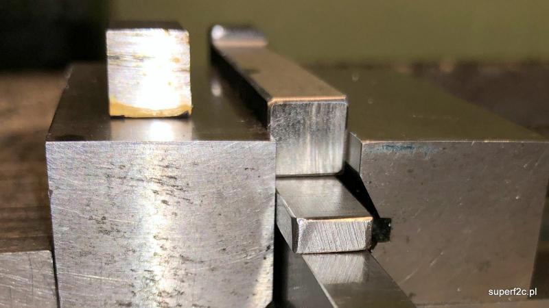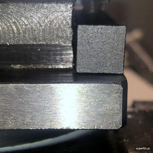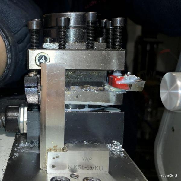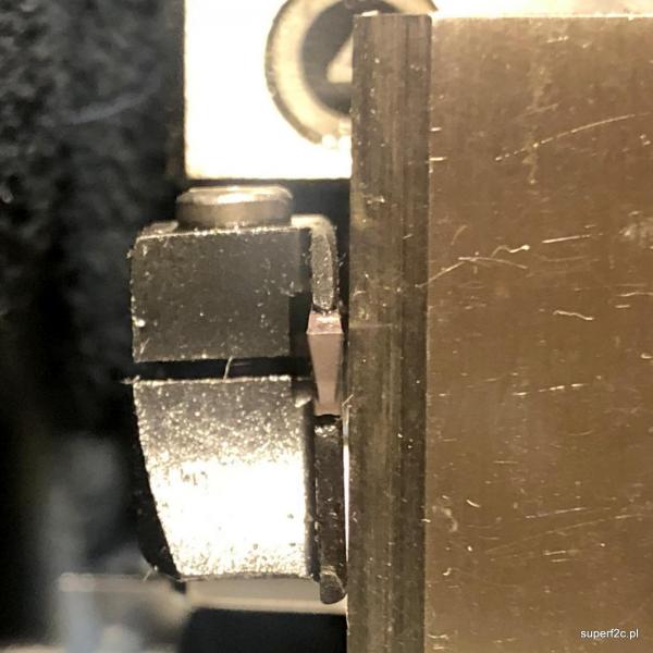 i od razu pojawił się drugi problem W elektrycznym zmieniaczu narzędzia samo narzędzie nie jest prawidłowo ustawione. I póki ręcznie ostrzyłem narzędzie to było to jeszcze akceptowalne. Ale jak chcę używać przecinaka z wymiennymi płytkami na paru tokarkach (5) to wypada narzędzia nie przerabiać a raczej imak. Tylko dzisiaj za bardzo nie wiem jak to rozkręcić... brakuje prostopadłości podstawy. Widać zatoczone czoło podkładki razem z promieniem R1.2 w trochę większym powiększeniu starannie obrobione niestety nie zachowane prostopadłości płaszczyzny bazującej od tyłu dokładnie widać jak jest przekrzywiony nóż tokarski co przy przecinaku jest to już drobny problem. -