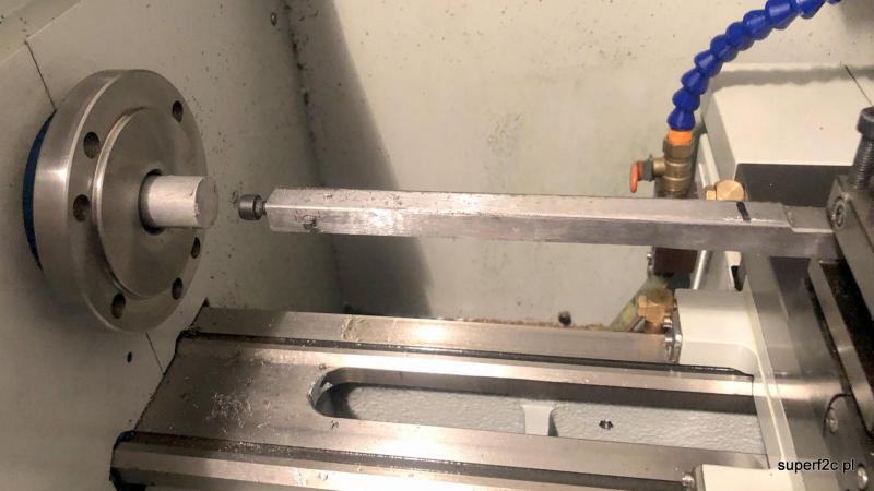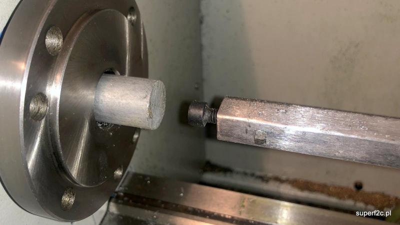 Wczoraj spotkała mnie przykra niespodzianka bo pręt PA6 średnicy 20 mm. mimo że z każdej strony wrzeciona tokarki CNC210 wchodzi to dziura ma prawie po środku wrzeciona kryzę i tylko wchodzi przelotowo pręt o średnicy 18 mm. Pozostało dorobić "bor-sztangę" do otworu 18 mm i poprawić fabrykę. udało się jak widać na załączonych fotografiach. samo narzędzie to trzpień z kawałeka widiowego freza fi 4 mm. Odpowiednio już razem z bor-sztangą zaostrzony. z tego pręta będą wykonane podkładki do śmigła. -