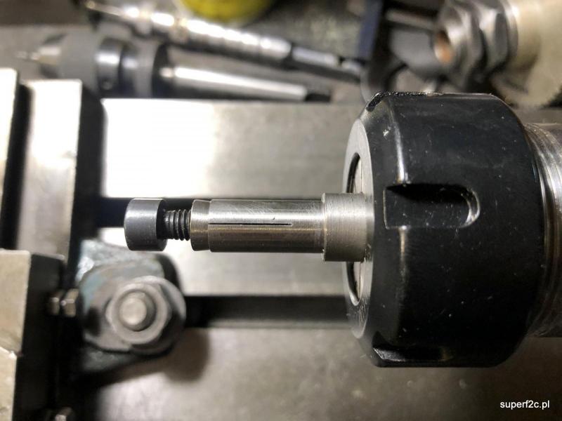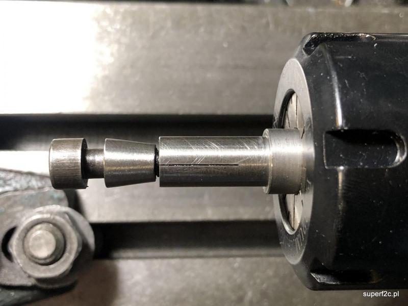 kalibrowanie narzynką wymagało dorobienia stosownego oprzyrządowania Narzynak załapana w szczękach zewnętrznych uchwytu uchwytu tokarskiego OUS-1 detal czyli karter silnika SiM 2b- część toczona wymagała dorobienia trzpienia rozprężnego rozprężanego stożkiem i śrubą M6 z drugiej ER32/ Morse'a2. wysunięty stożek z drugą dłuższą śrubą demonstracyjną. sam moment rozcinania co by powstała rozprężna tulejka. Tulejka rozprężna działa i kalibracja jak widać ma sens bo zostają delikatne wiórki po obróbce. -